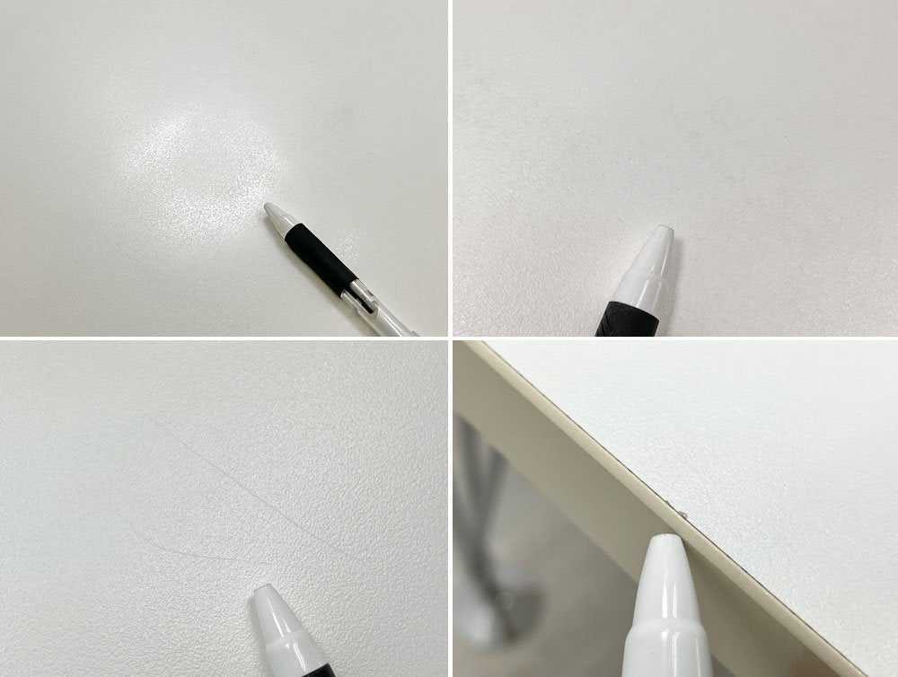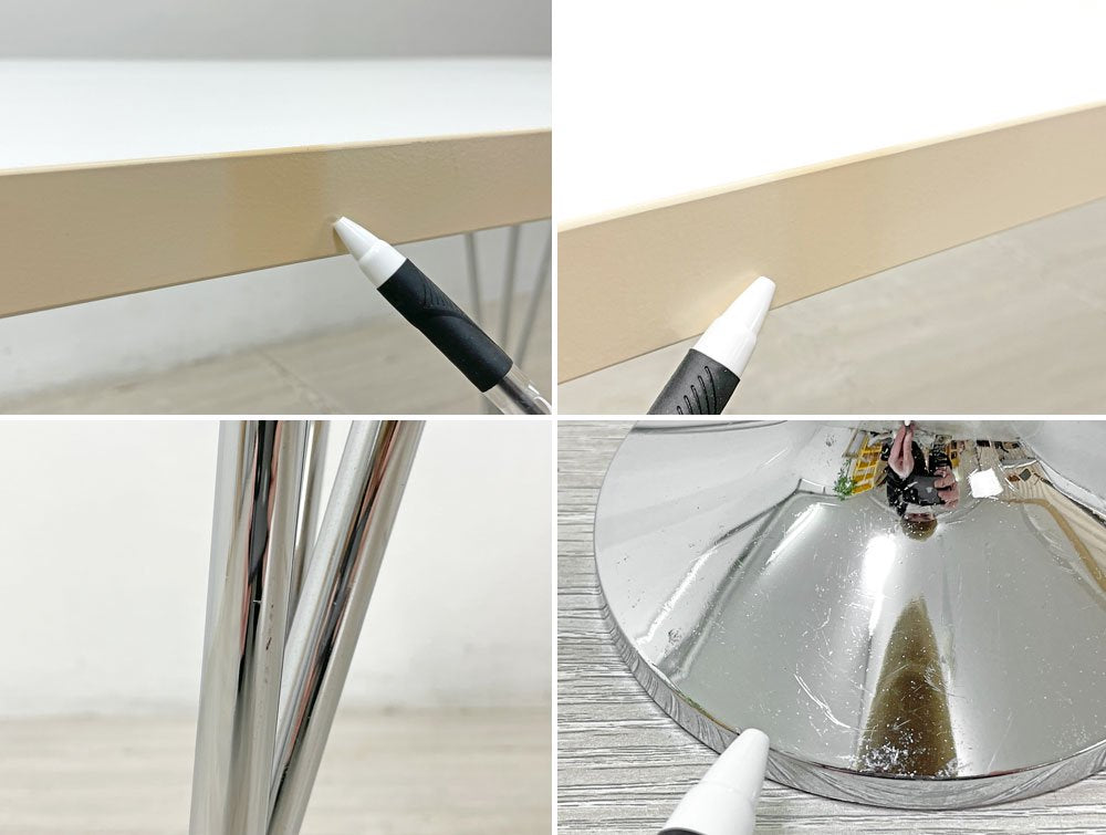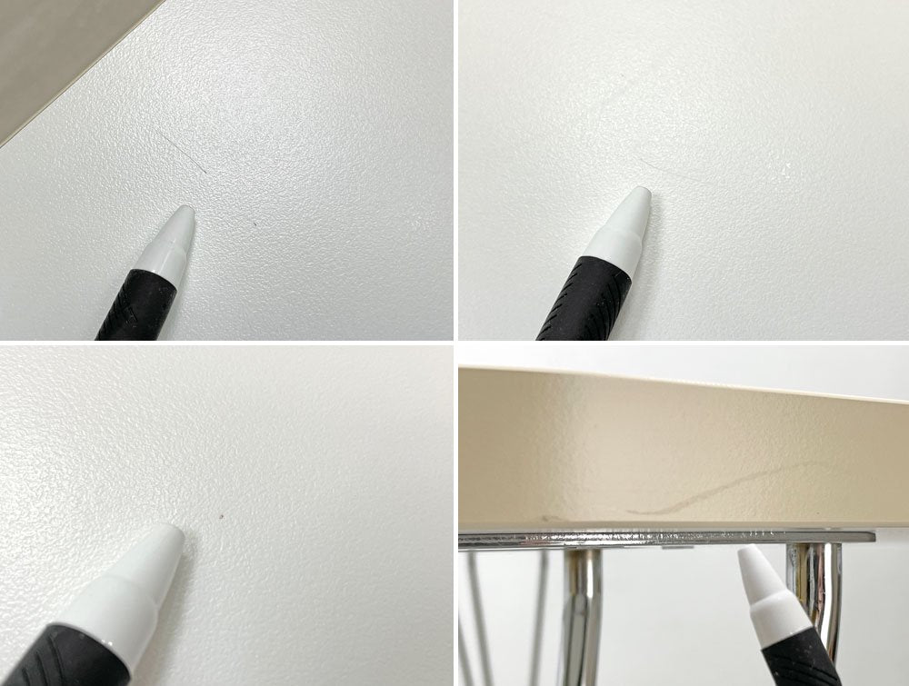 使用に伴う擦れ傷の他、うっすらとした線傷やてかり、染み、つま先程の小さな欠け、天板縁の僅かな黄変やフレームにはくすみや軽度の錆等が見られるもののいずれも大きく目立つものではございません。グラつき等ご使用に問題となるダメージの見られない、USED品として概ね良好なコンディションを保っております。