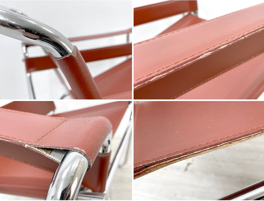 フレームの各所にくすみ、小さなメッキの剥がれが見受けられます。レザーには縁の擦れや傷が散見されますが、著しく目立つ様なダメージは無く、今後も十分実用頂けるコンディションを保っております。