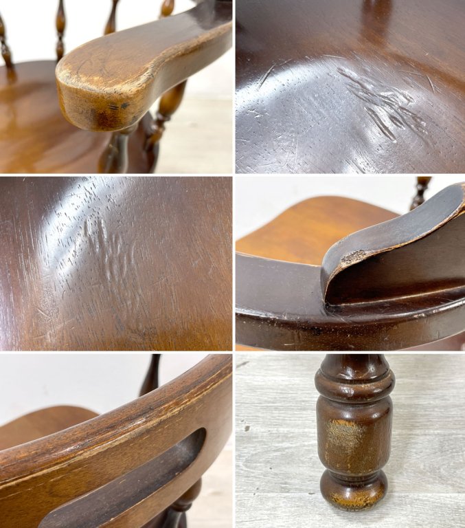 背もたれやアームに塗装の薄れ、座面に線状の圧痕が複数見受けられます。