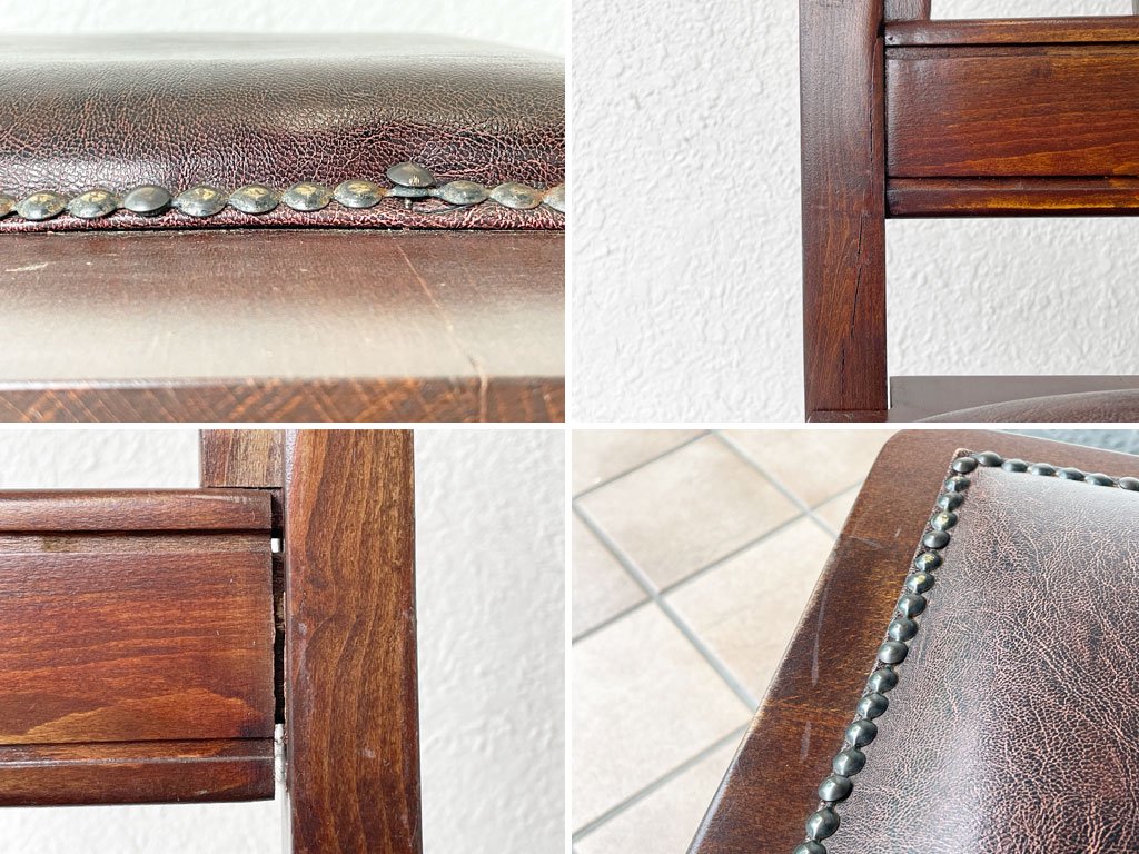 使用に伴いフレームには擦れや小傷が散見される他、クラックや接合部に隙間の出来ている箇所が見受けられますが、使用に支障はございません。また、1脚には一部シート縁の鋲の緩みとそれに伴った若干の張地の浮きが感じられますが、こちらも着座に影響のあるものではございません。ガタツキ等使用上大きな支障となるダメージは見られず、これからも安心してお使い頂けるコンディションを保っております。
