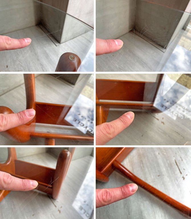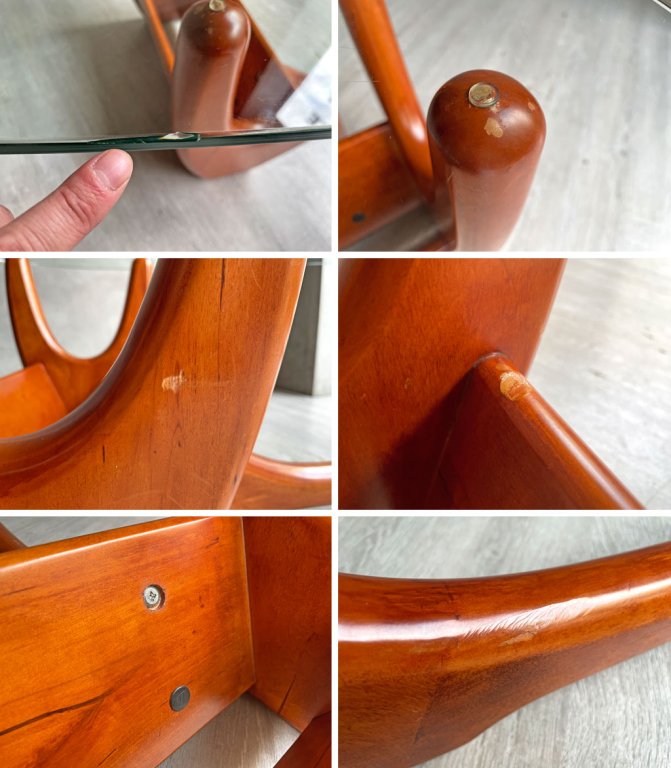 ガラスの広範囲に細かな線傷が見られるほか、縁にやや目立つ欠けがございます。そのほか、ビス穴を隠すキャップが一か所欠品しており、木部にはペイントロスを伴う打痕や、細かな線傷や擦り傷が散見されるものの、通常使用に支障を来すような不具合はございません。