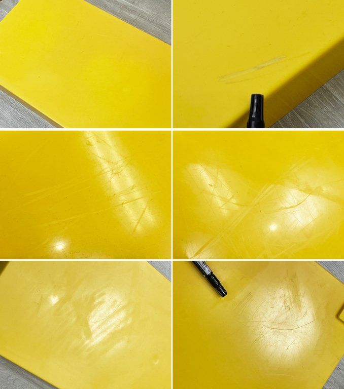 こちらはビンテージのお品物です。使用に伴い擦れや傷、落としきれない汚れが多数見られる他、経年に伴い全体的にヤケによる変色、色ムラなどがございます。また角に欠け、接合部にヒビ割れが数箇所あるものの、現状通常使用に問題はございません。今後もビンテージならではの風合いをお楽しみ頂きながら、実用頂けるコンディションを保っております。