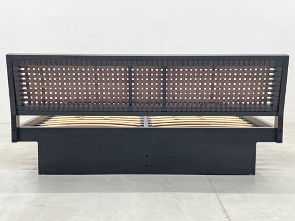 ヘッドボードには、厚みのあるしっかりとしたレザーを編み込みでデザインされ、モダンさと温かみを感じさせるベッドフレーム。