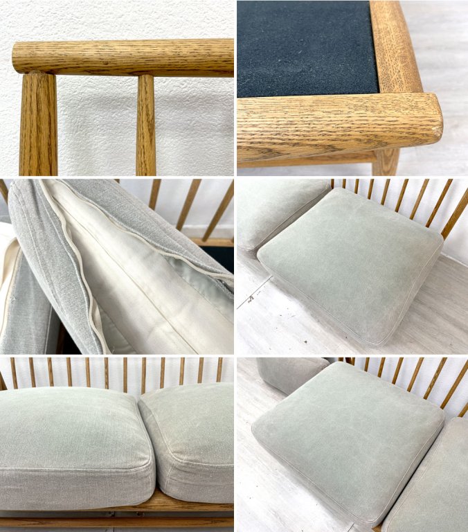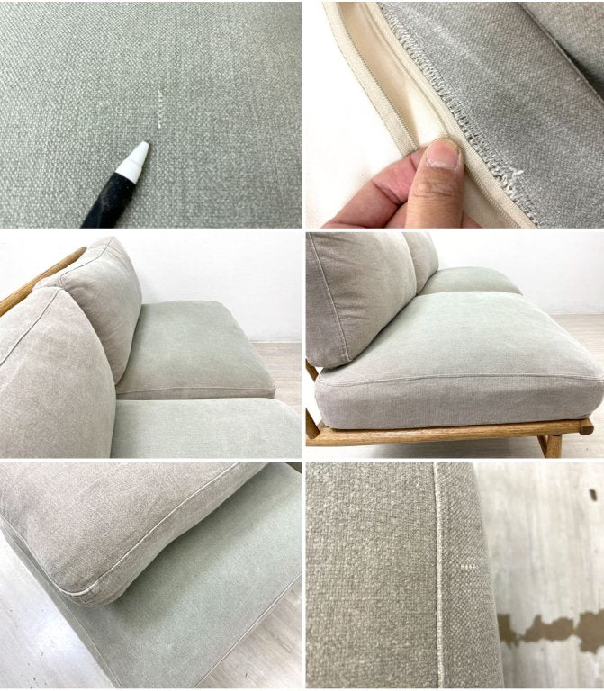 ファブリックには摩耗による座面部分に色合いの変化、軽微な糸連れ、チャック付近の縫製の解れ等、ある程度の使用感がございます。このファブリックの色合いは、見る角度や照明によって見え方が変わりますが、昼光色の明かりで見るとやや緑がかった色に見えます。