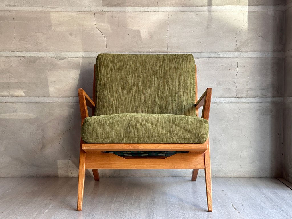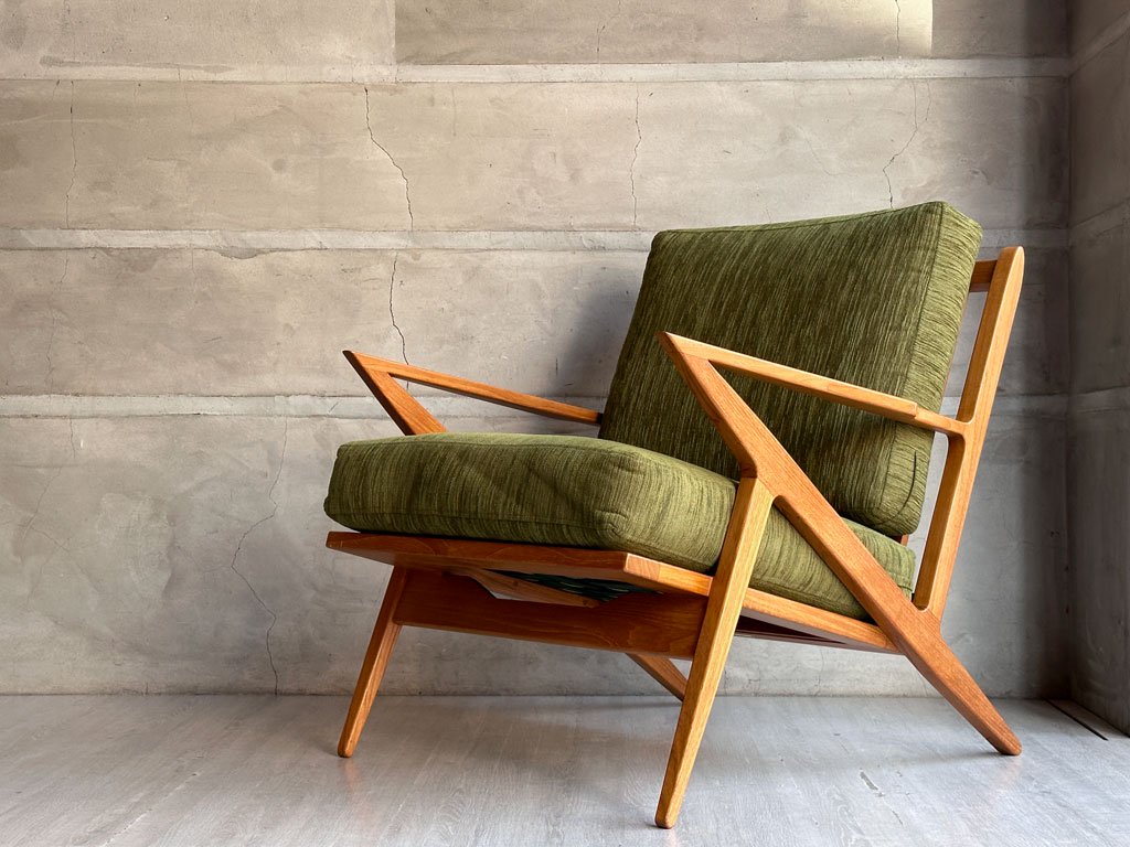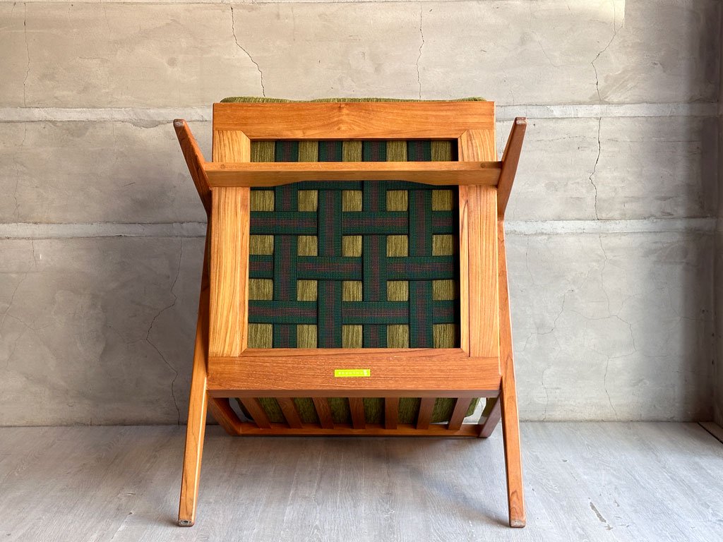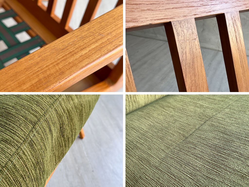 全体的に直線を多用したシルエットですが、チーク材のナチュラルな風合いとグリーンのファブリックによって柔らかな印象に仕上がっています。