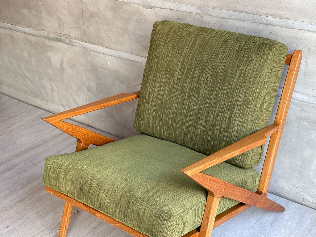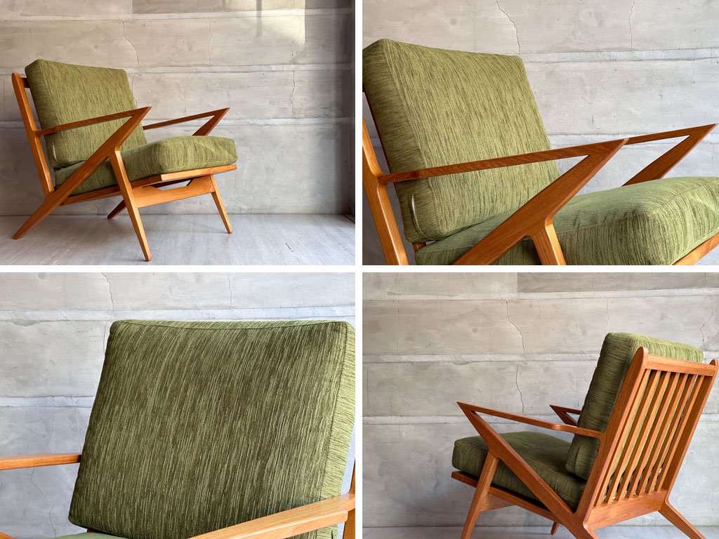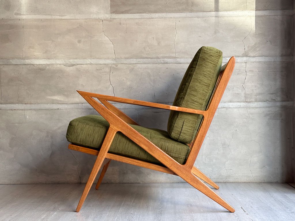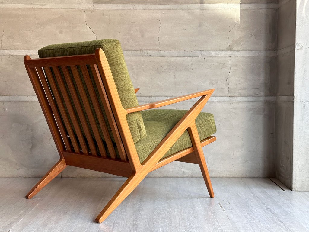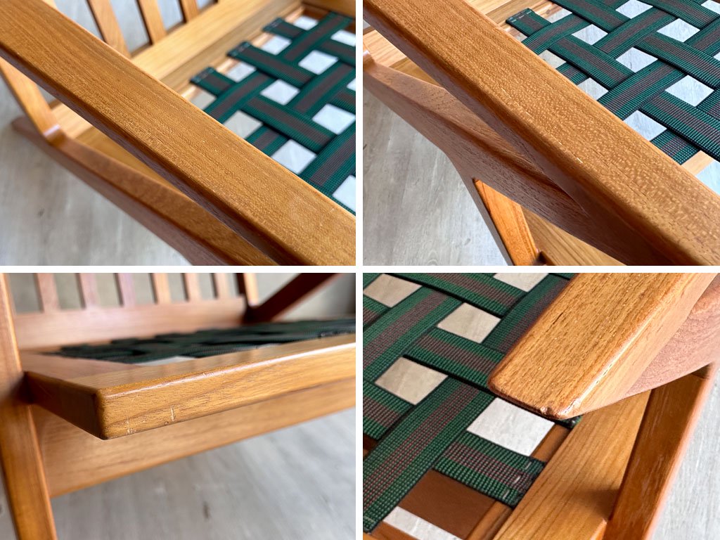 全体的に直線を多用したシルエットですが、チーク材のナチュラルな風合いとグリーンのファブリックによって柔らかな印象に仕上がっています。