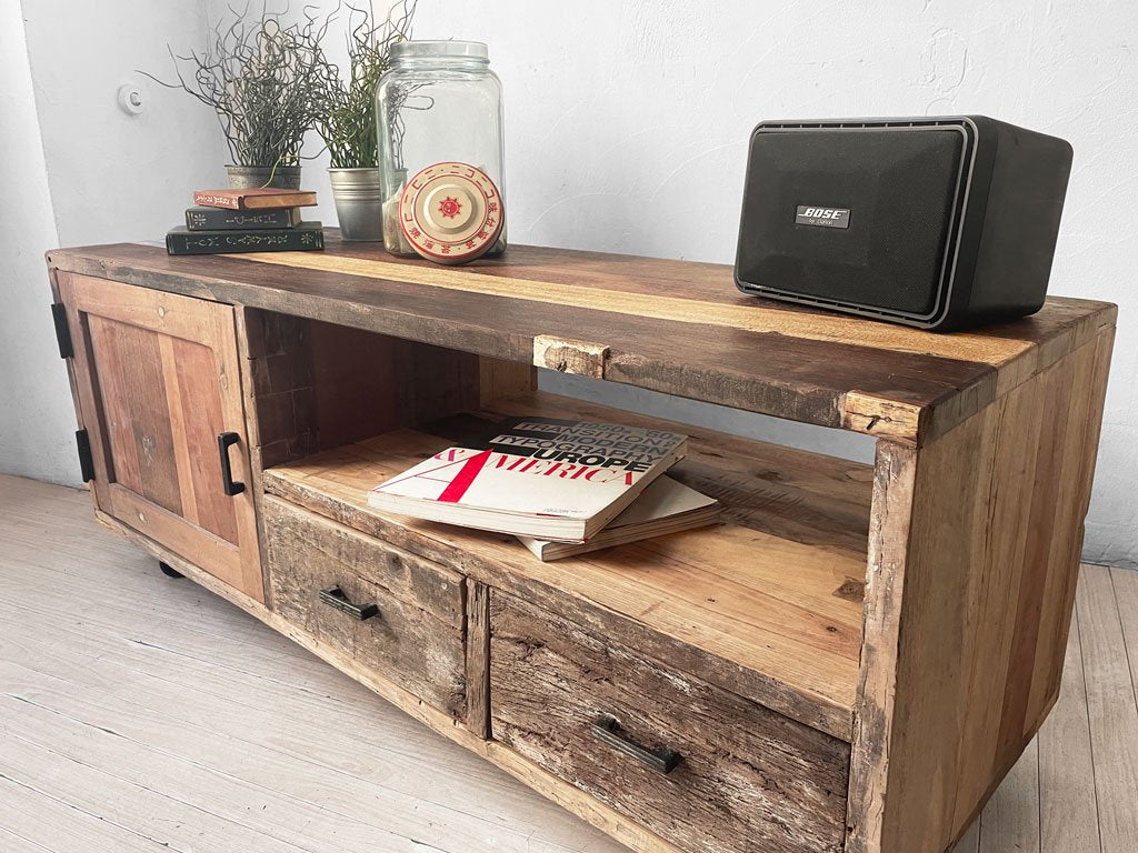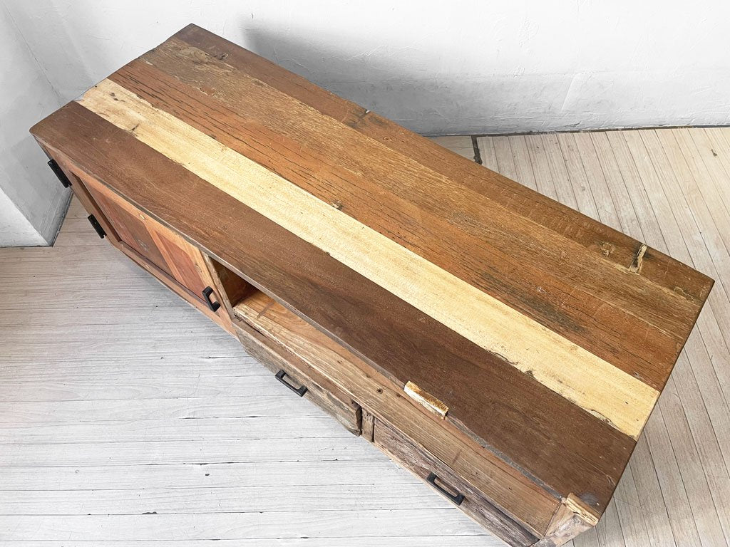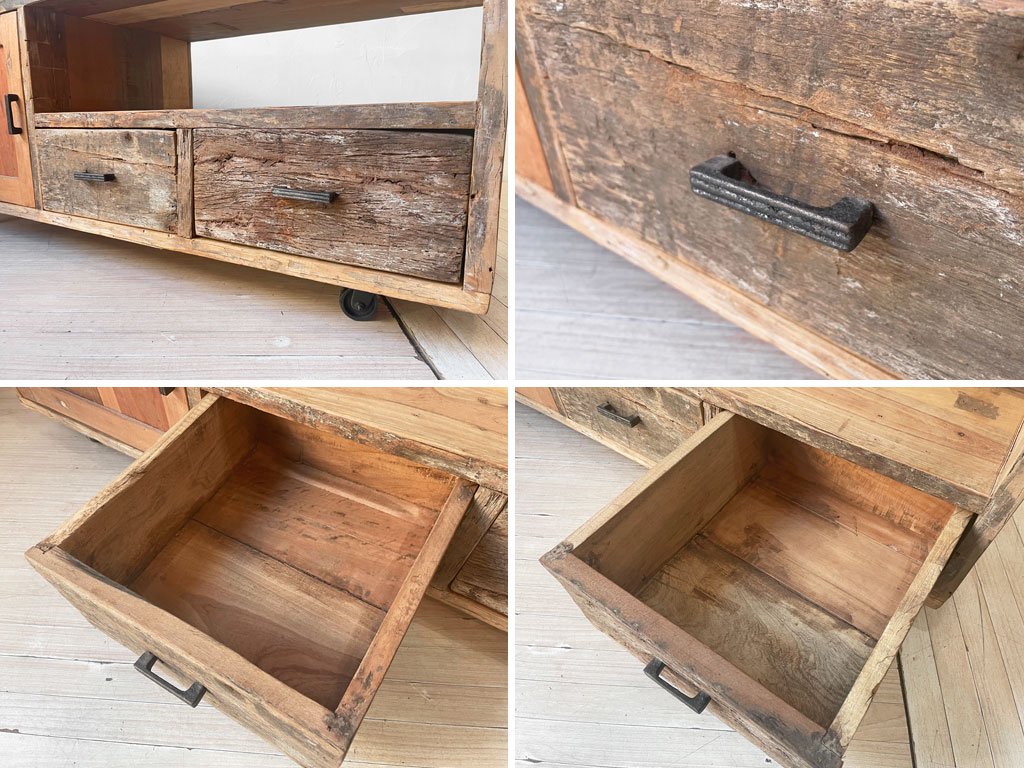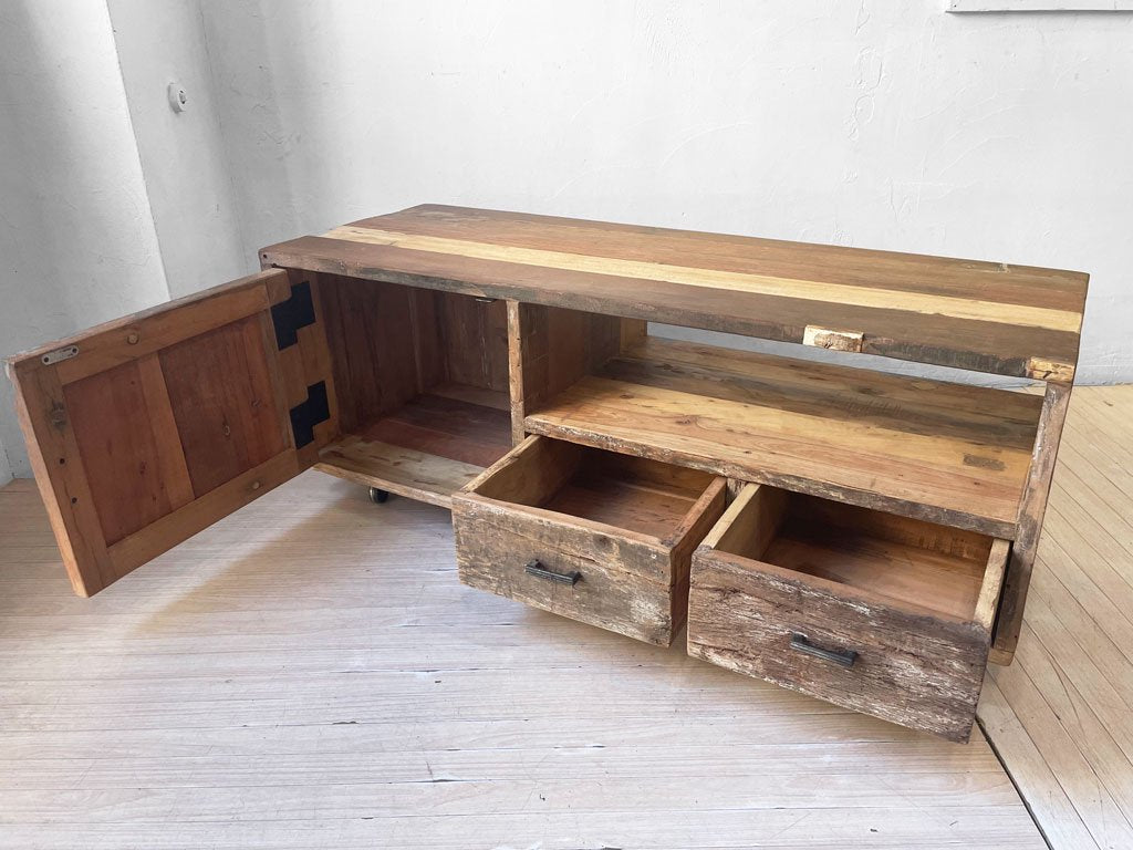 古材特有の杢目や傷がそのままデザインに昇華されたたこちらのAVボードは、使用された古材によって風合いが異なり一点物の様な特別感を味わえます。
