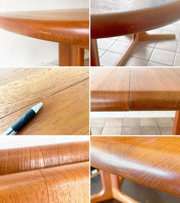 こちらはビンテージ品です。天板は専門業者によるサンディング、ラッカー塗装が施されており、僅かな擦れや傷はありますが非常に綺麗なコンディションです。脚には染みや小傷が散見されますが、大きく目立つダメージは見られません。追加天板と脚には一部極僅かな隙間のあいている箇所がございますが、こちらも目立つものではございません。以上、経年なりのダメージはございますがガタツキや割れは無く、ビンテージ品としましては良好なコンディションを保っております。