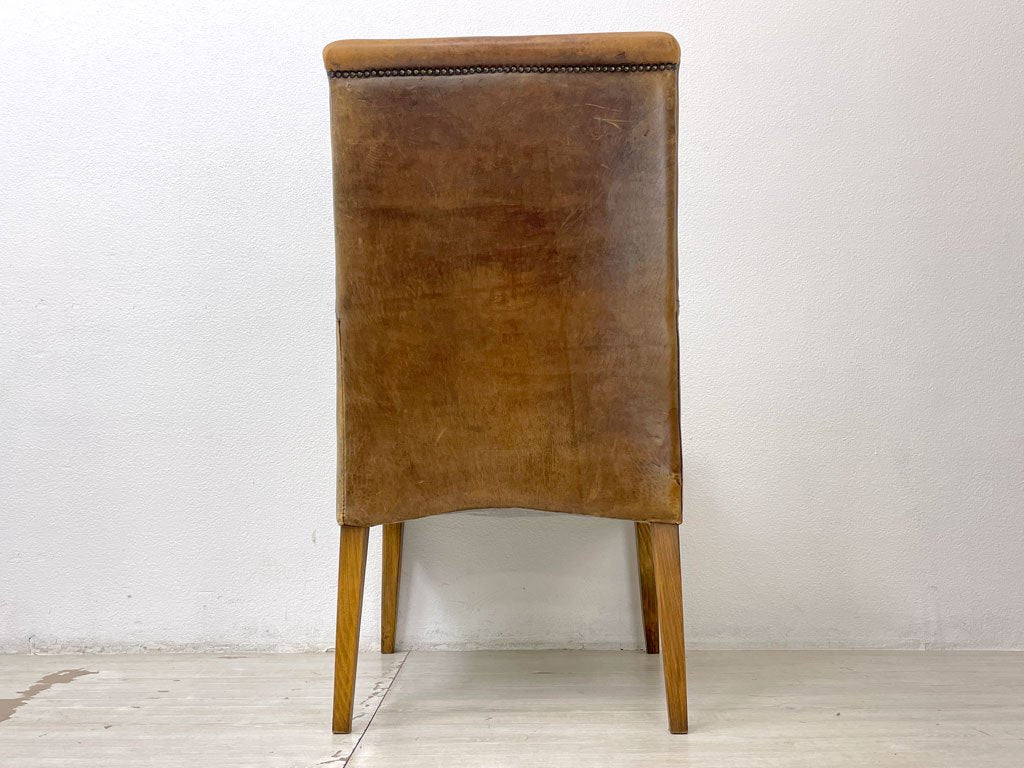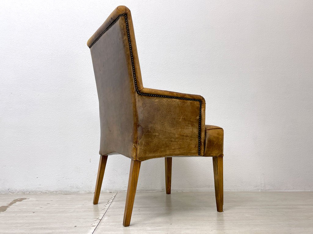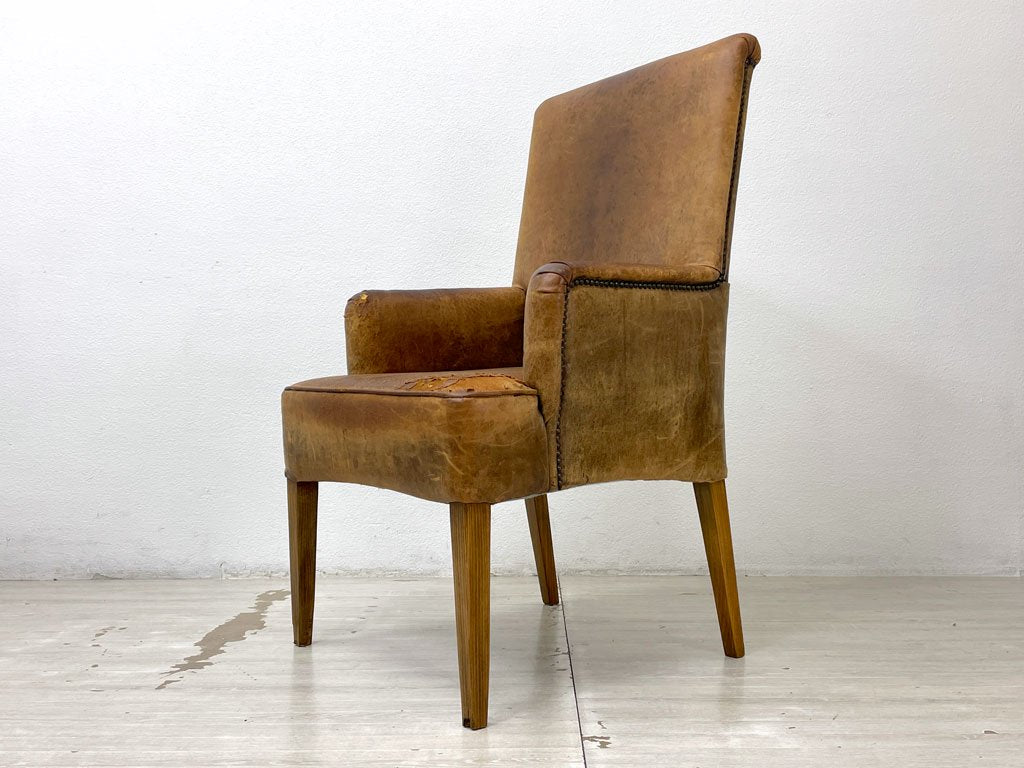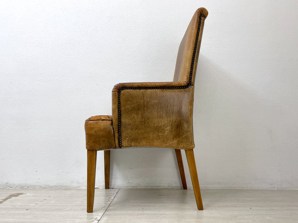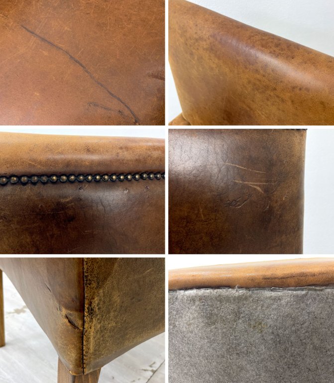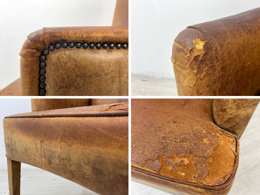 ブラウン色の本革は時間経過とともにひび割れや破れ等が所々見受けられ、ビンテージライクな現代の量産家具では生み出せない奥深さを感じさせます。背もたれとアームには鋲打ちが施されアクセントに。流行りのインダストリアルデザインや工業系インテリアと合わせてシックで大人びた男前インテリアを演出してくれます。ホームユースは勿論、ショップ什器として空間の一角にディスプレイするだけでも画になります。