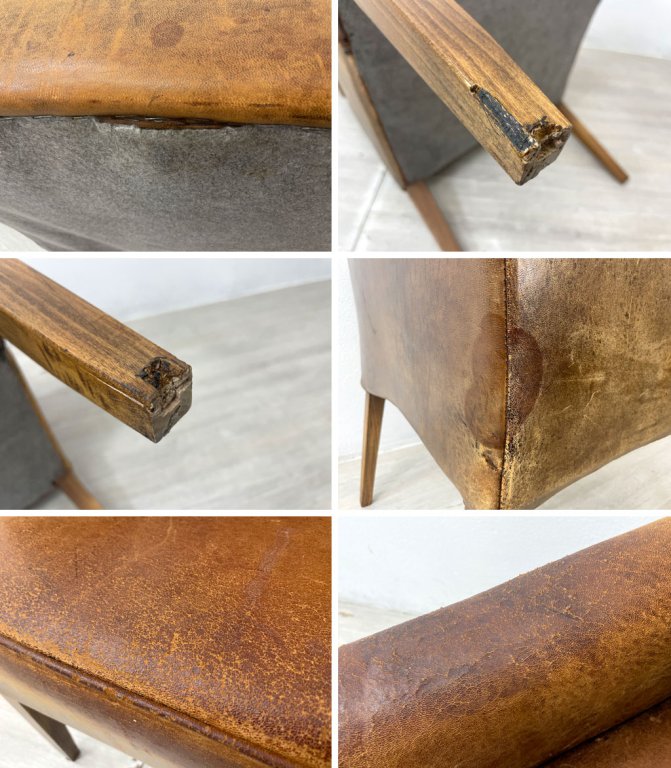 使用や経年に伴い全体的な擦れやレザー表面のひび割れ、色褪せ、破れ、脚部には打痕や補修痕がございます。全体的に使用感がございますが、ビンテージの風合いとしてとお楽しみ頂けると幸いです。また今回はコンディションを考慮しての安価でのご提供となります。予めご了承くださいませ。