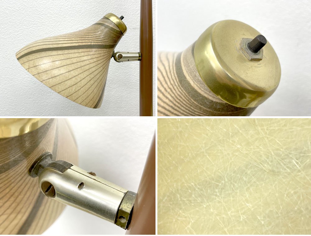 アメリカンミッドセンチュリーを色濃く感じるFRP製のシェードと、温もりあるブラウン色のスチール製の支柱、それらを引き締める真鍮色の金具で構成されたバランスの取れた美しい1台。
