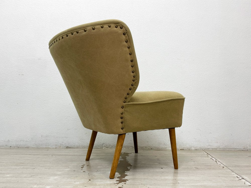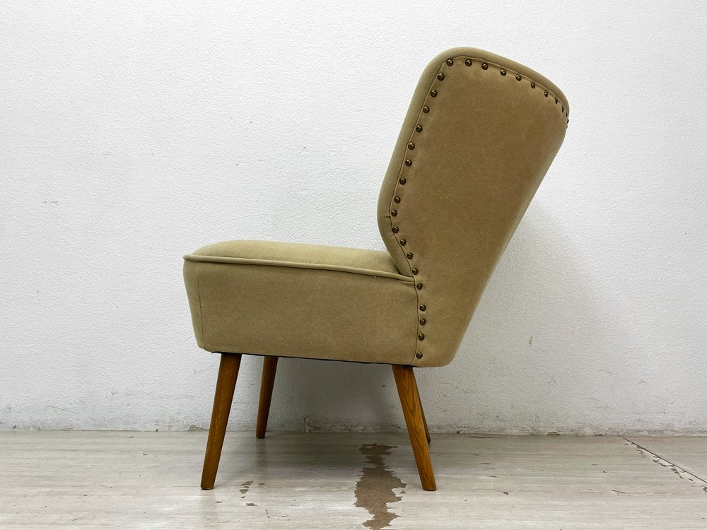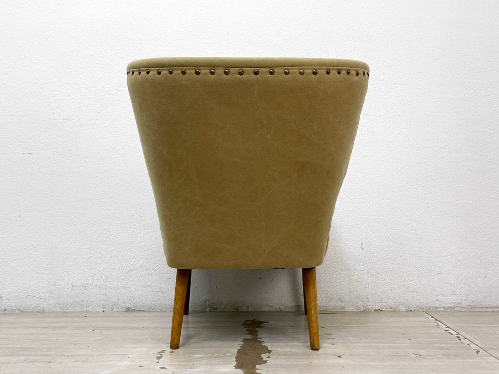 現在では珍しい伝統的なアオリバネというスプリングコイルを座面に使用する事で、絶妙なフィット感と高級感を実現。縦に凹凸のあるラインで仕上げ、厚みをしっかり持たせた背もたれは、両サイドより包み込むようにカーブを描き、着座の際の心地よいホールド感を感じさせてくれます。背もたれ背面にはアンティークゴールド色の鋲打ちが施されバックスタイルのアクセントに。脚部にはオーク材を使用し、木の呼吸を止めないオイル仕上げが施されています。