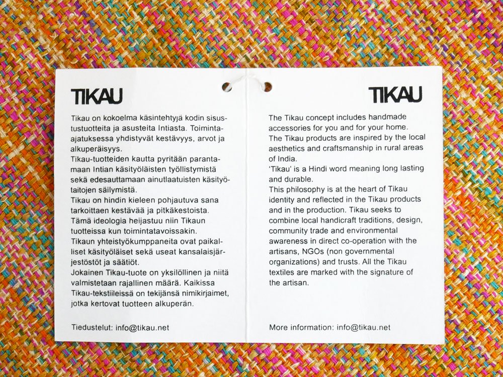 ヘルシンキを拠点に活動するブランド”TIKAU(ティカウ)”。インドの農村部に暮らす貧困層の経済的自立支援を目的に発足したプロジェクトから生まれたサステナブルなブランドで、フィンランドの伝統的なデザインとインドの高度な職人技で作られるファブリックアイテムは、世界中で親しまれています。