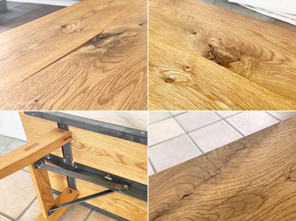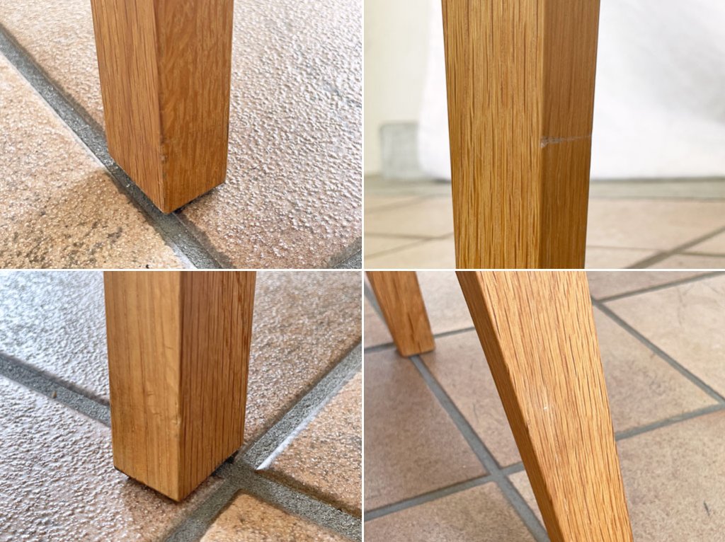 天板には無垢材特有の節や凹凸が見られますが、こちらは味としてお楽しみ頂けます。使用に伴い脚に細かな線傷や打痕、天板や金具に微細な擦れ等は見られますが美観を損ねるダメージはございません。また、脚の接合部には構造上僅かな遊びがございますが、使用時には自重により安定しグラつくこともございません。全体的に使用感の少ない良好なコンディションを保っております。