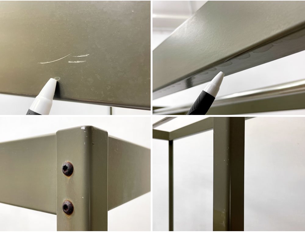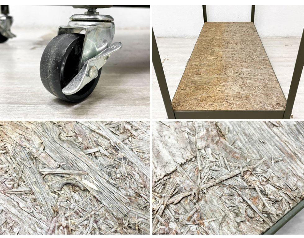 使用に伴う擦れ傷の他細かなスクラッチ、金具の錆び、OSBボードにはヤケや剥がれ等が各所に見られますが、インダストリアルな風合いと相まって、いずれも風合いを損なうものではございません。OSBボードはその性質上毛羽立ちがあり剥がれやすいものとなっております。付着を気になさる場合は敷物等を用いてのご使用をお勧め致します。ご使用に問題となるダメージは無く、今後とも雰囲気を楽しみながらご使用頂けるコンディションを保っております。