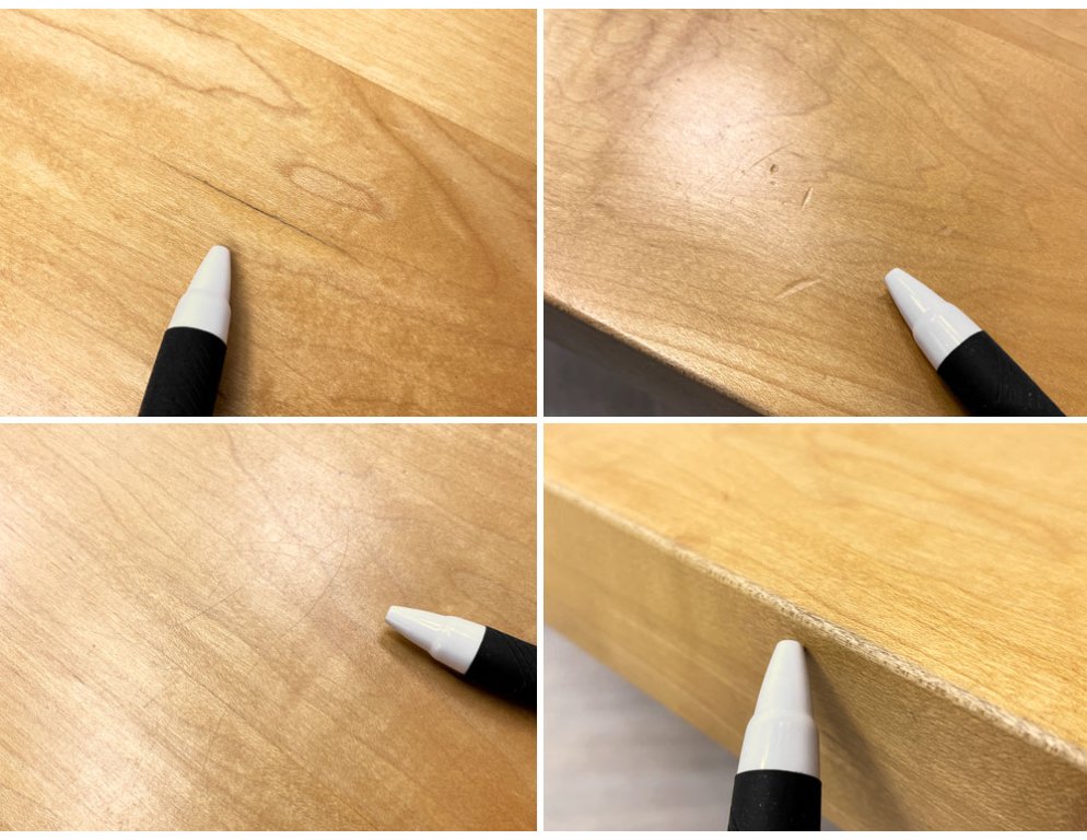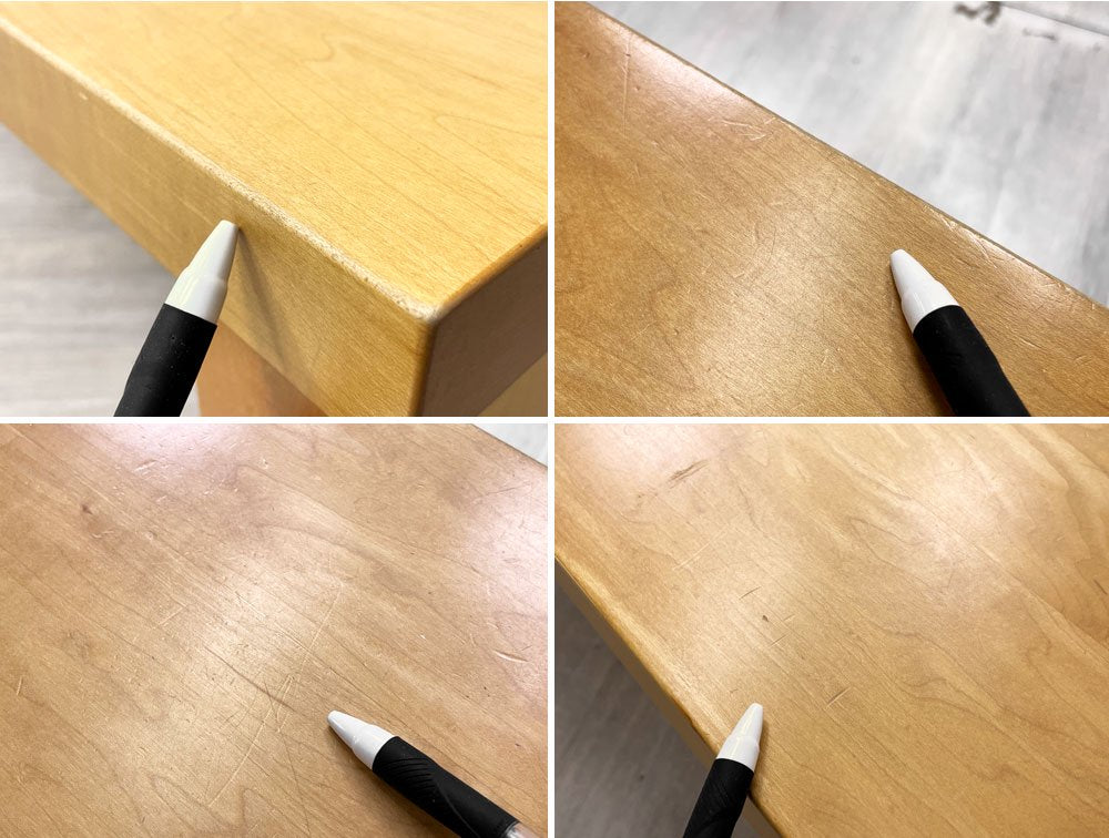 使用に伴う擦れ傷の他、天面には全体的に細かな打痕や線傷などわずかに使用感がございますが、いずれも大きく目立つものではございません。グラつき等ご使用に問題となるダメージは無く、良質な無垢材を用いた風合いを今後ともお楽しみ頂けるUSED品として概ね良好なコンディションを保っております。