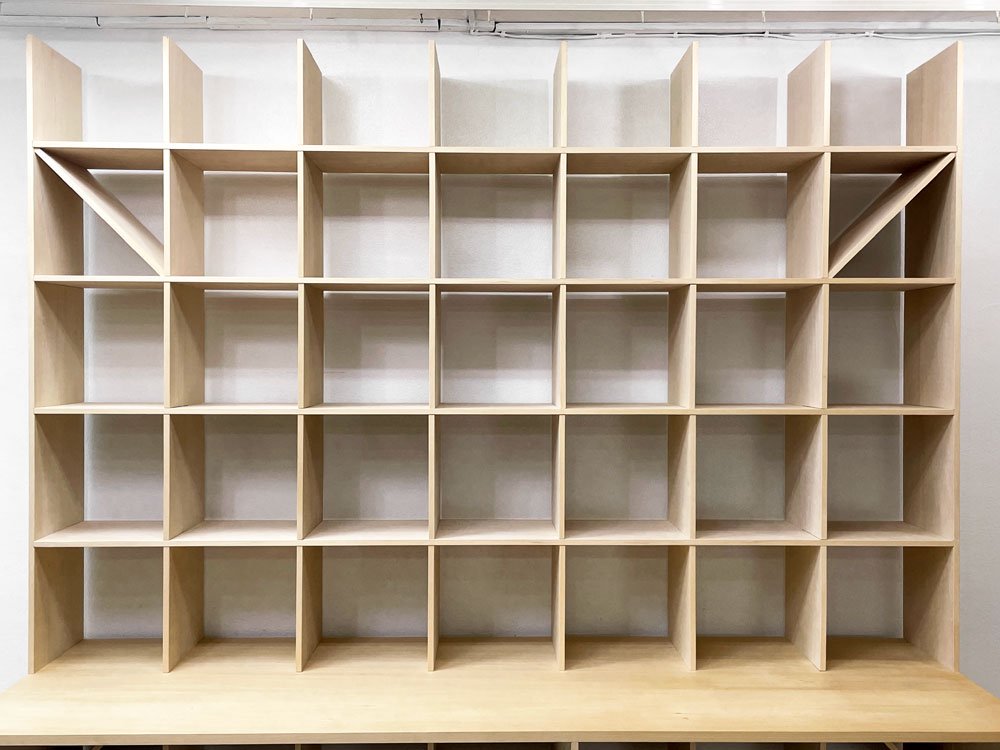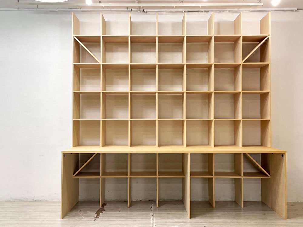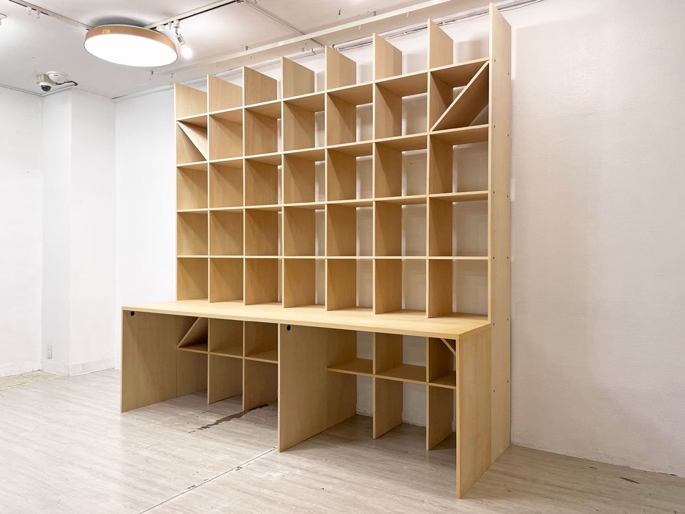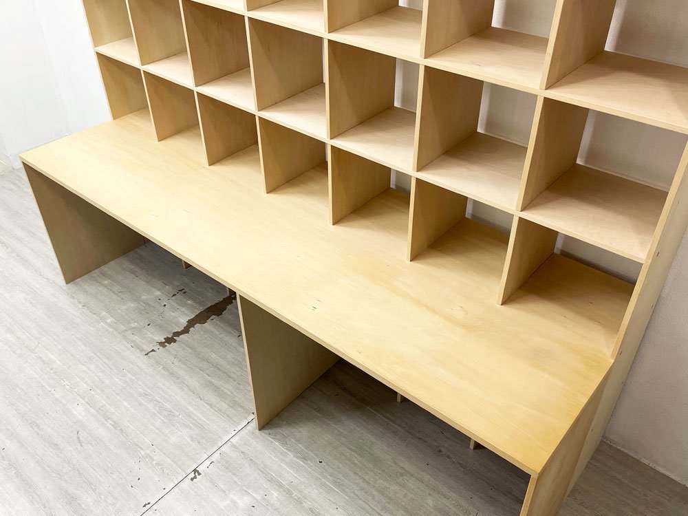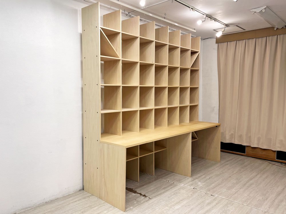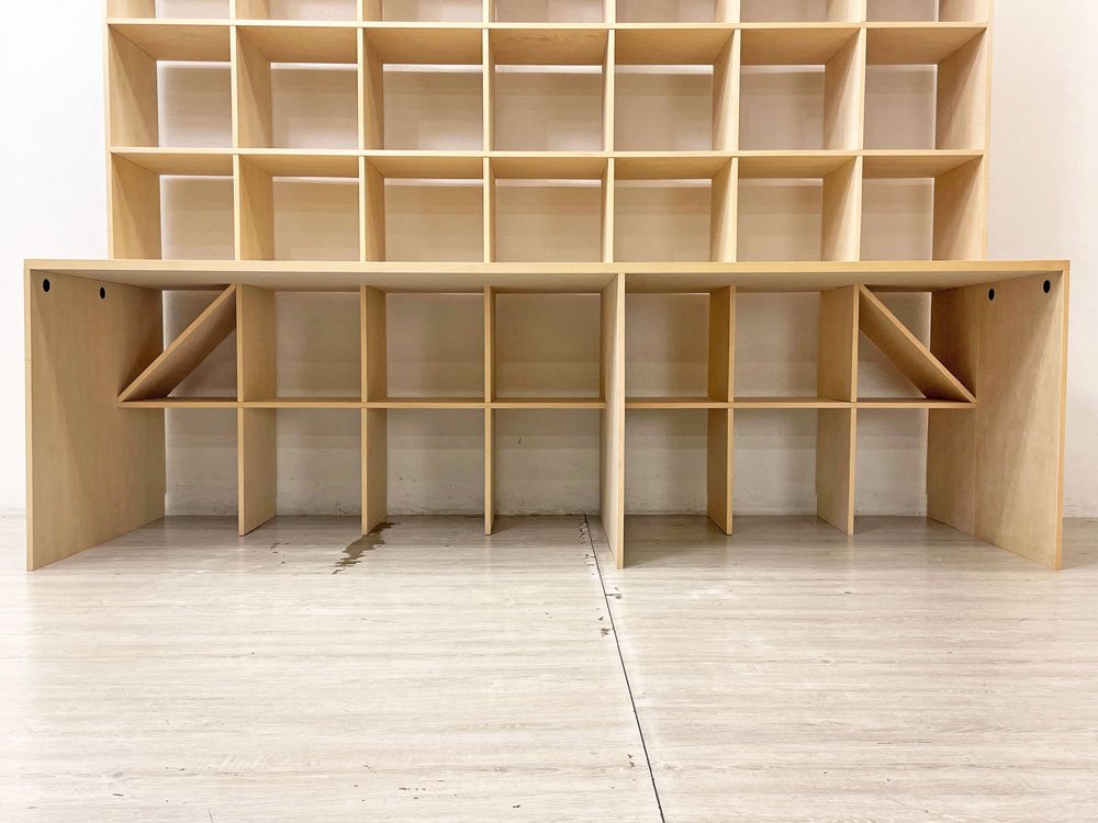 マルゲリータ margherita カウンター付き本棚 奥行350mm 縦7コマ×横7コマ オープンシェルフ 本棚 デスク シナ材 無塗装 壁面収納 ミニマル カット有 定価250,800円 ●
