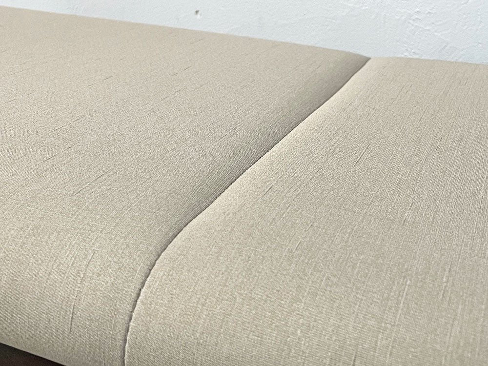ブラウンカラーのウッドフレームにベージュ系のファブリックを組み合わせた上品な仕上がりのベンチ。