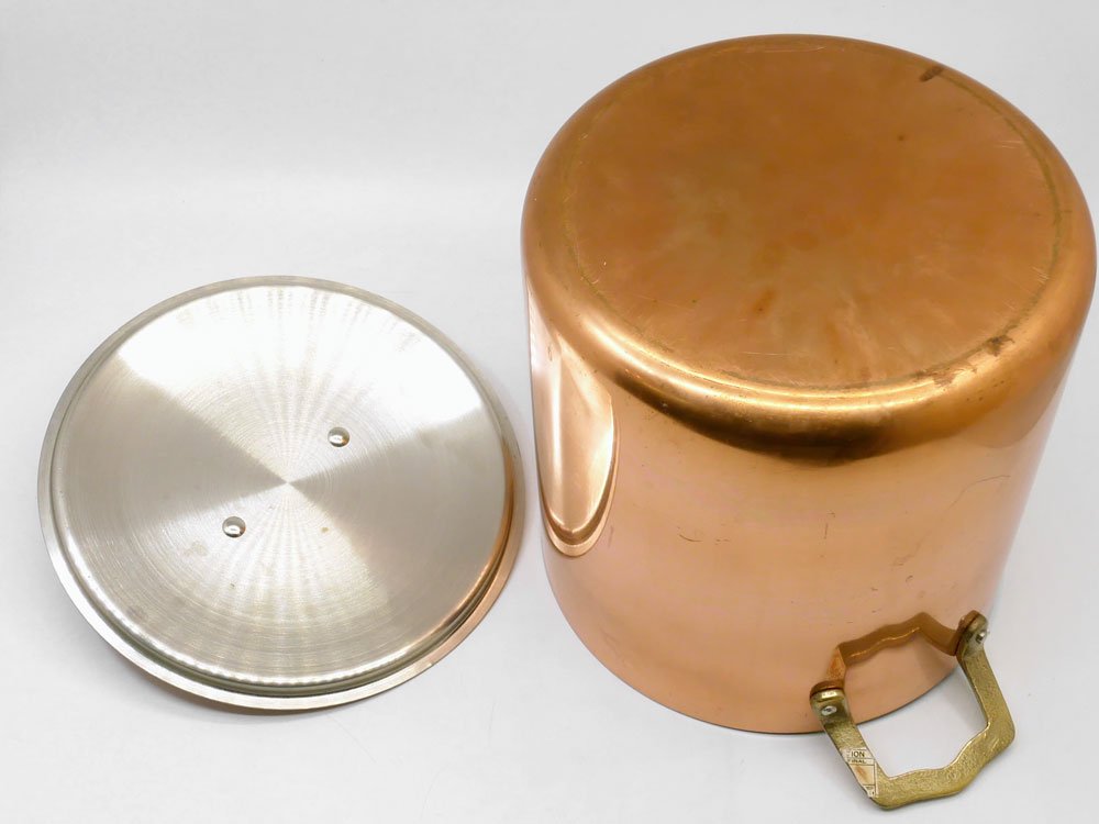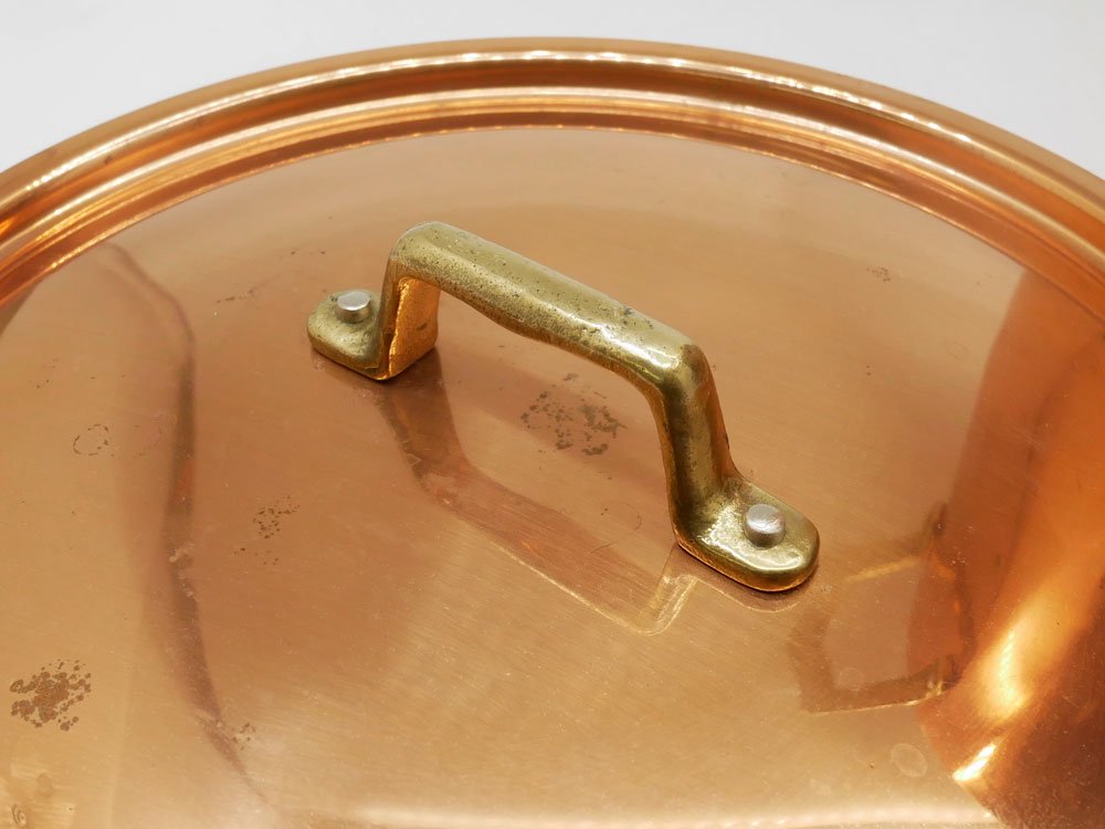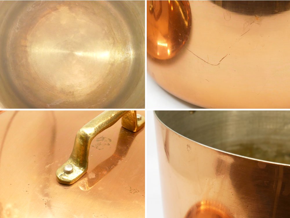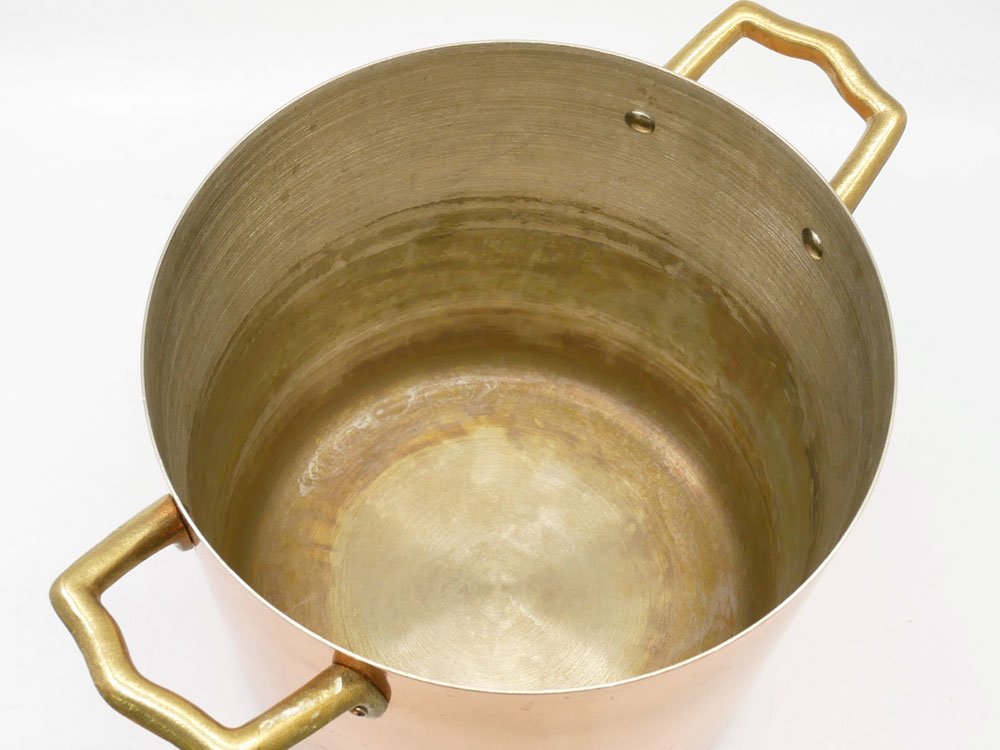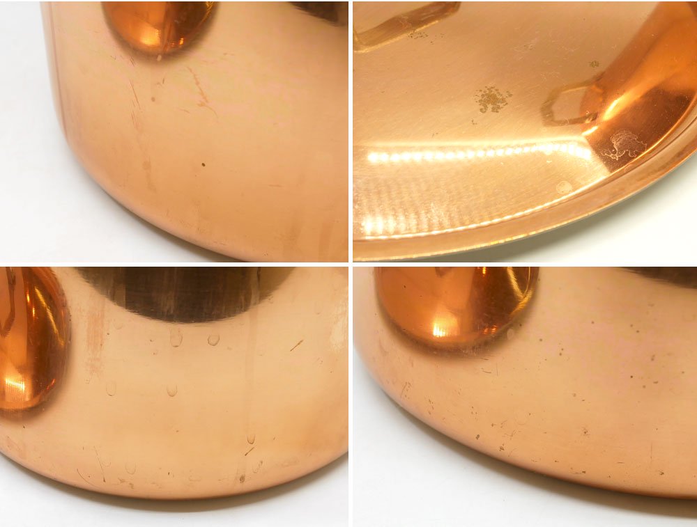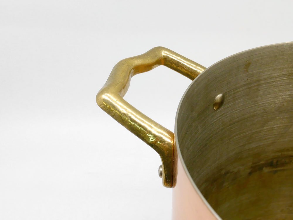 各所に銅特有のくすみ、研磨による軽微な擦れ、内部には使用に伴う色合いの変化が見受けられます。多少の使用感はございますが、銅鍋はいずれもこのように変化していくものであり、実用に問題はございません。今後も末永くお使い頂けるお品物です。