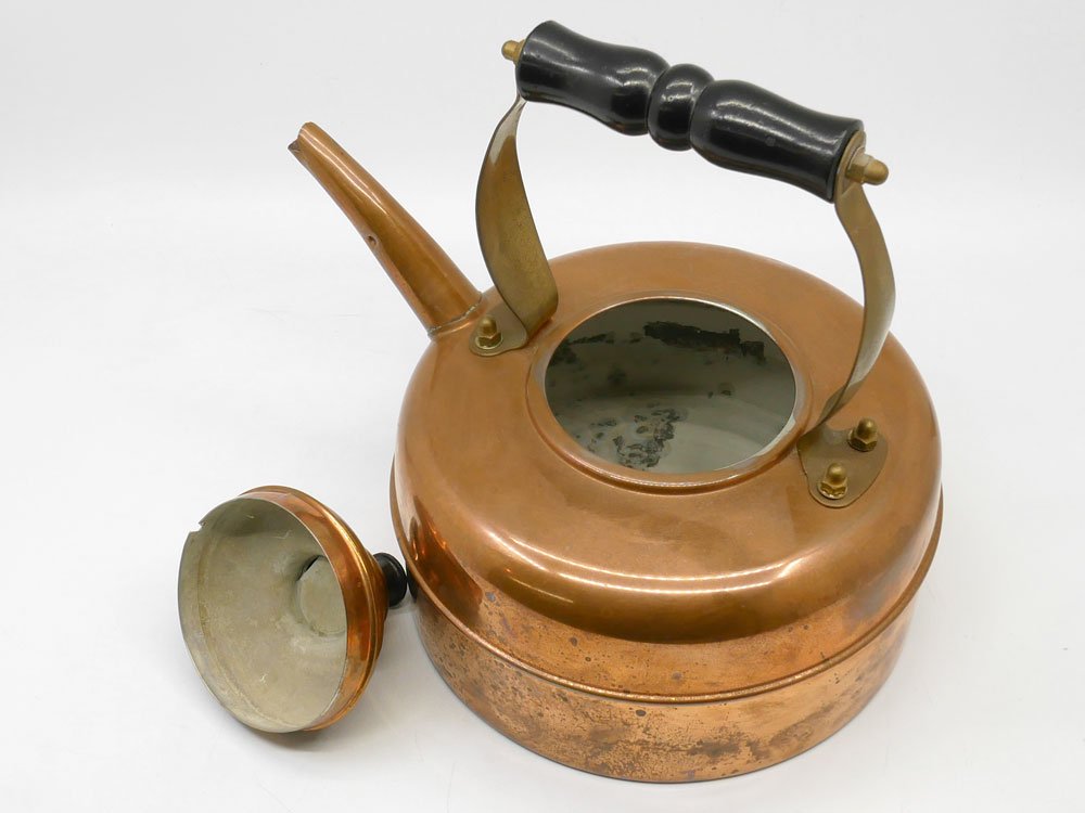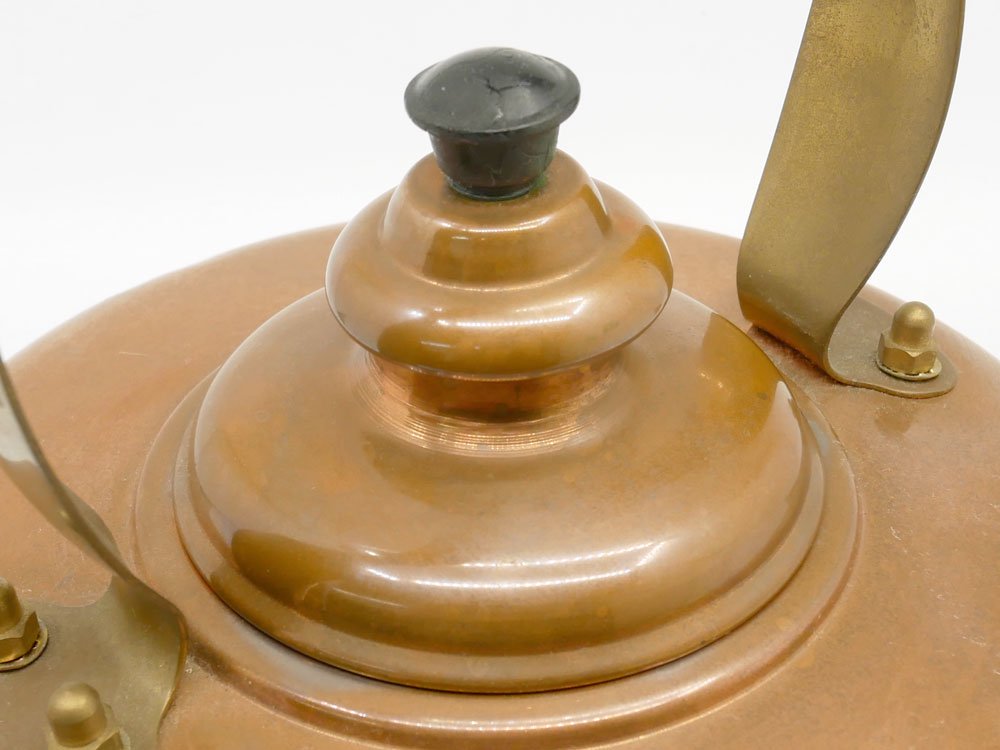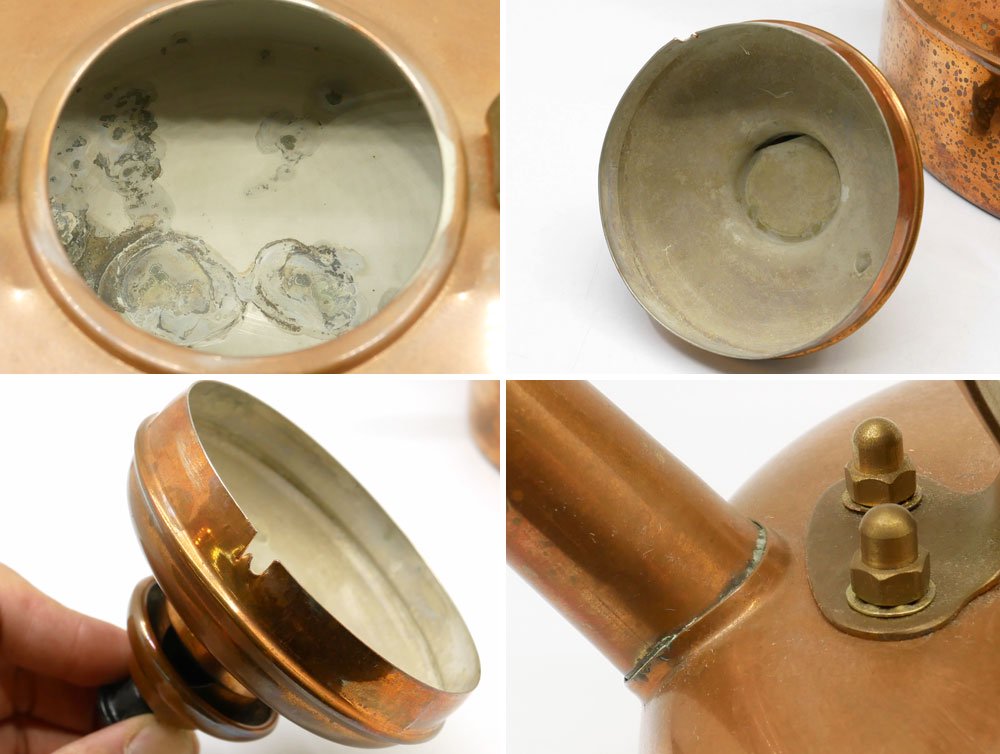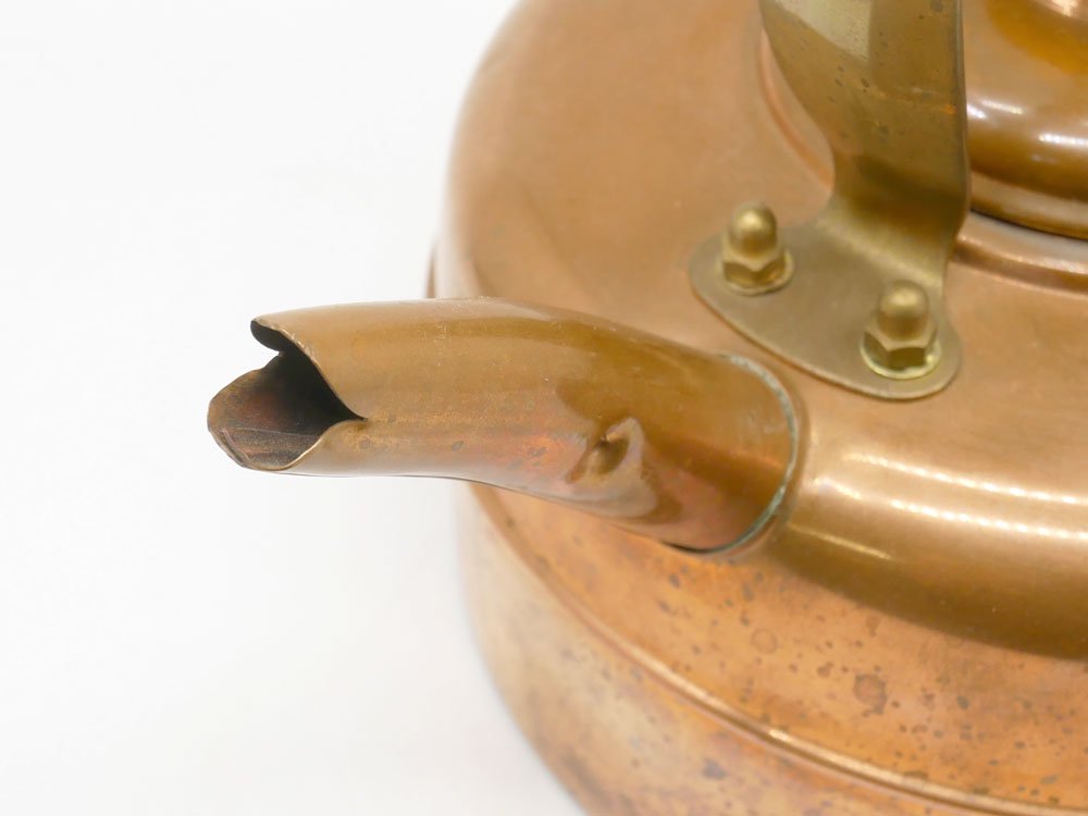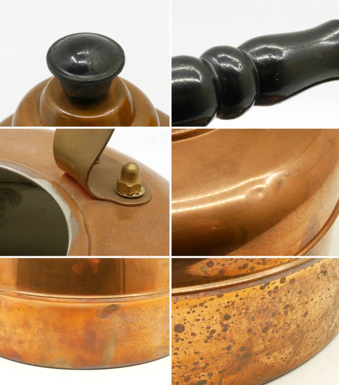 全体に銅特有の酸化やくすみ、木製ハンドルに細かな打痕、内部に錫メッキの剥がれがございます。また、蓋のツマミには表面的なひび割れ、ケトルの一部に小さな凹みがある等、ある程度の使用感はございますが、ビンテージケトルのような風合いとして楽しみつつ、今後も実用頂けるお品物となっております。