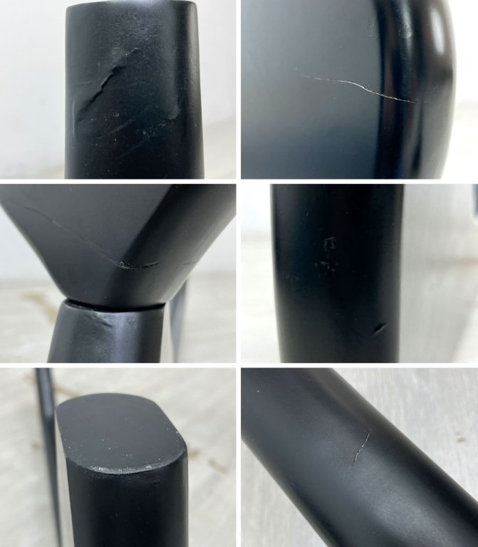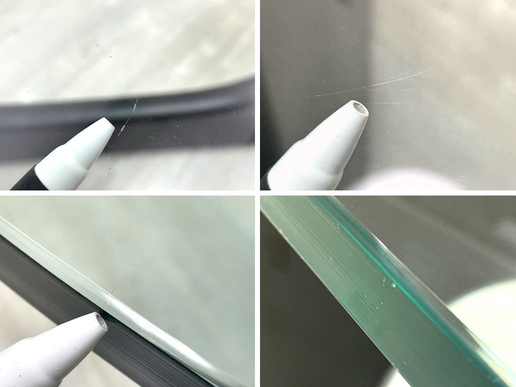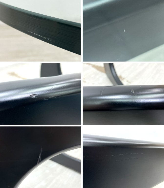使用に伴い、木部フレームに擦れや傷、打痕が全体に散見され、側面には表面的なヒビが数箇所見られるものの、実用強度に問題はございません。ガラス天板には軽微な傷や擦れはあるものの、欠けなど美観を損なうダメージは見られず、今後も気持ち良くお使いいただけるコンディションを保っております。