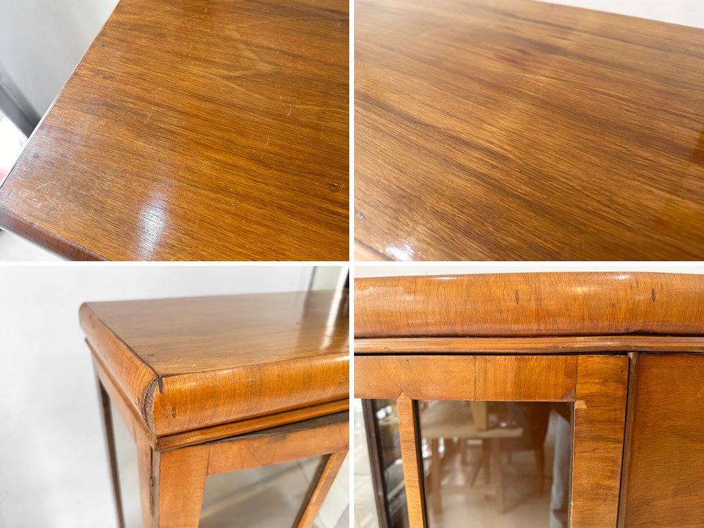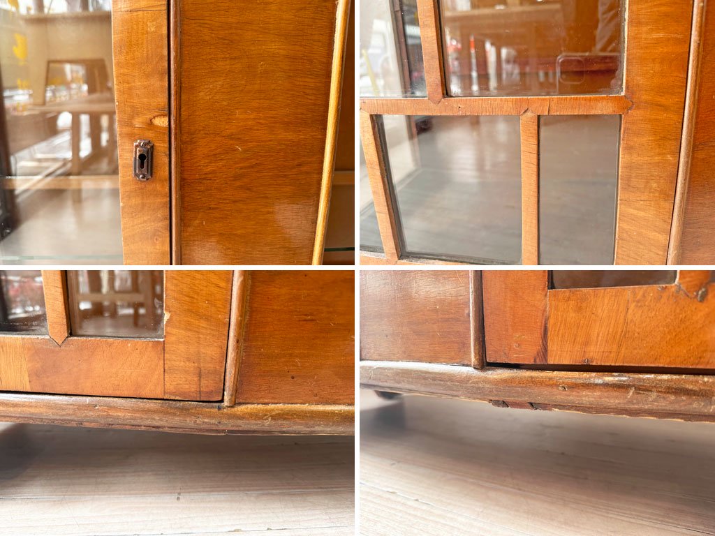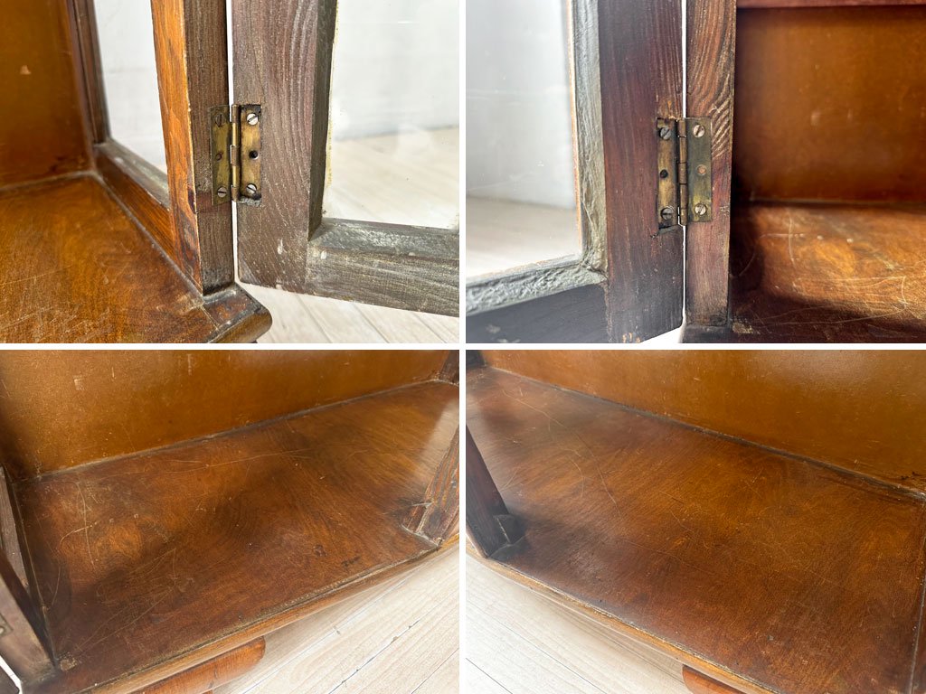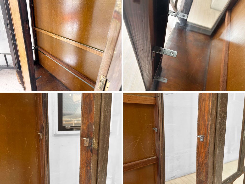 こちらは、ビンテージのお品物となります。使用・経年に伴い、傷や擦れ、打痕や突板の剥がれ、色ムラやペイントロス、落としきれない汚れ、扉のガラス止めの欠けや補修痕といったダメージが散見されます。シリンダー(錠前)内部に僅かなズレがあり、鍵が差し込みずらくなっておりますが、使用には問題ございません。棚板の高さ調整用の金物は後年に付けられたものとなります。また、内部のガラス棚板は一枚欠品しております。扉の丁番金物のビスが数本欠品しておりますが、強度に問題はございません。経年なりのダメージはございますが、使用に問題となるダメージは無く、これからもビンテージ品ならではの風合いを楽しみながらご使用頂けるコンディションを保っております。