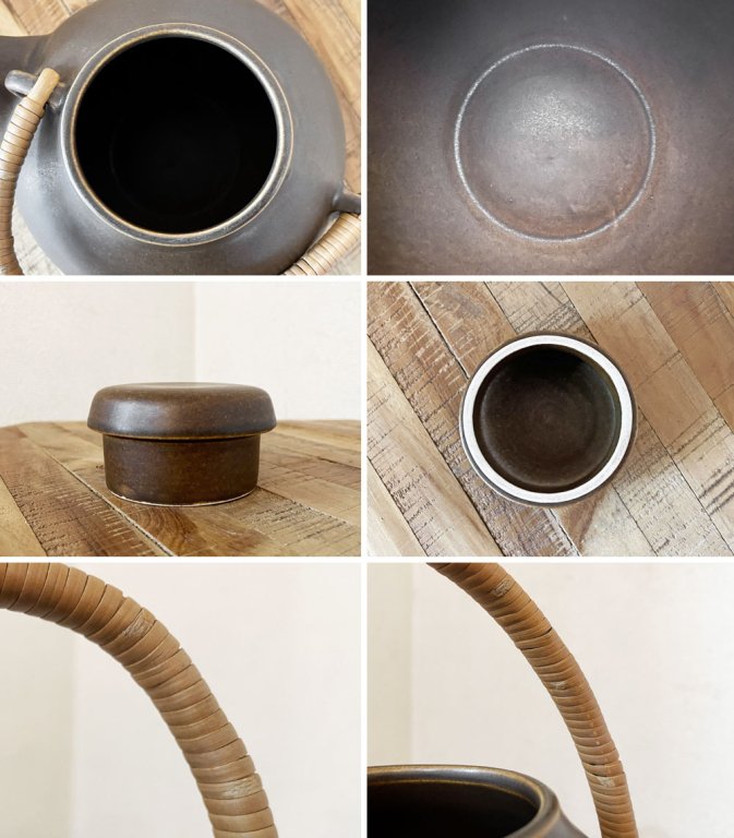 マットなブラウン色と籐巻きのハンドルにころんと丸いフォルム。日本の急須のような渋さをまとい、紅茶だけでなく煎茶も楽しみたくなります。
