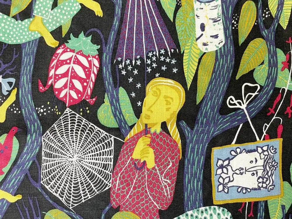 ブラックをベースに色とりどりに描かれた人物や植物たち。明るく華やかな雰囲気をお楽しみ頂けます。