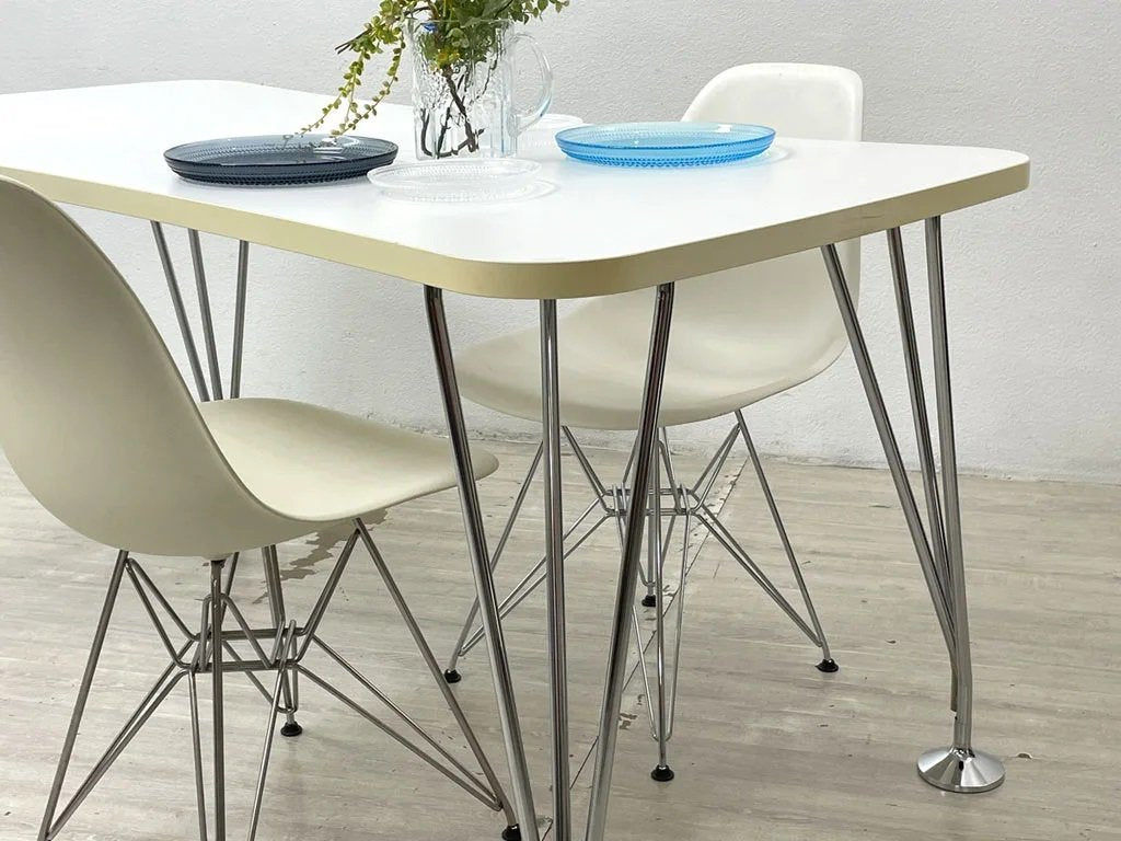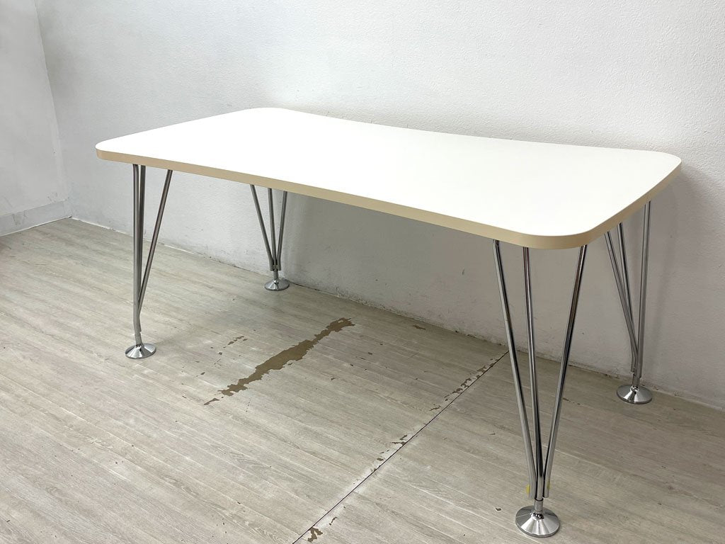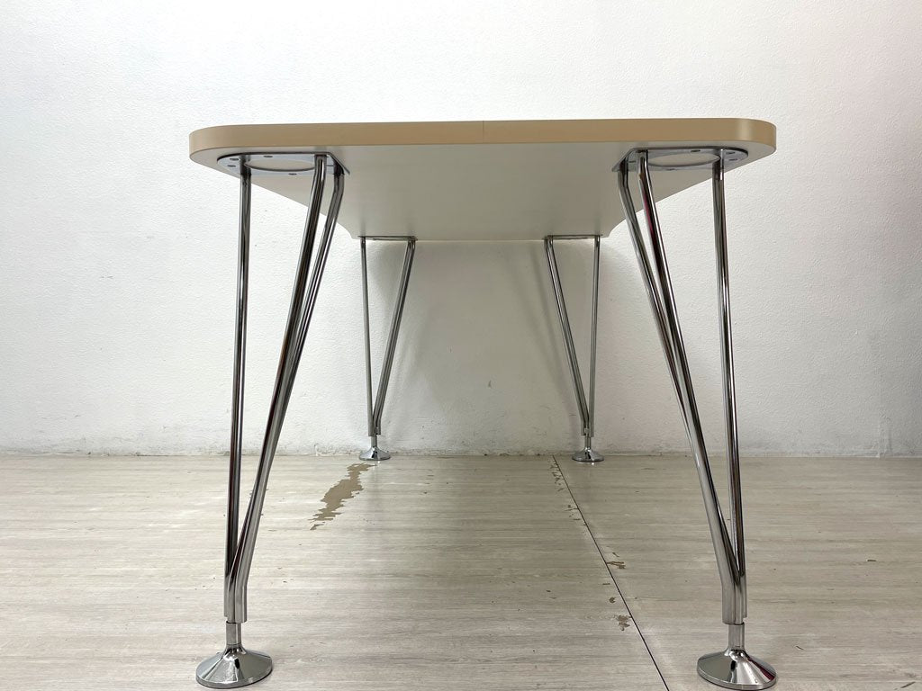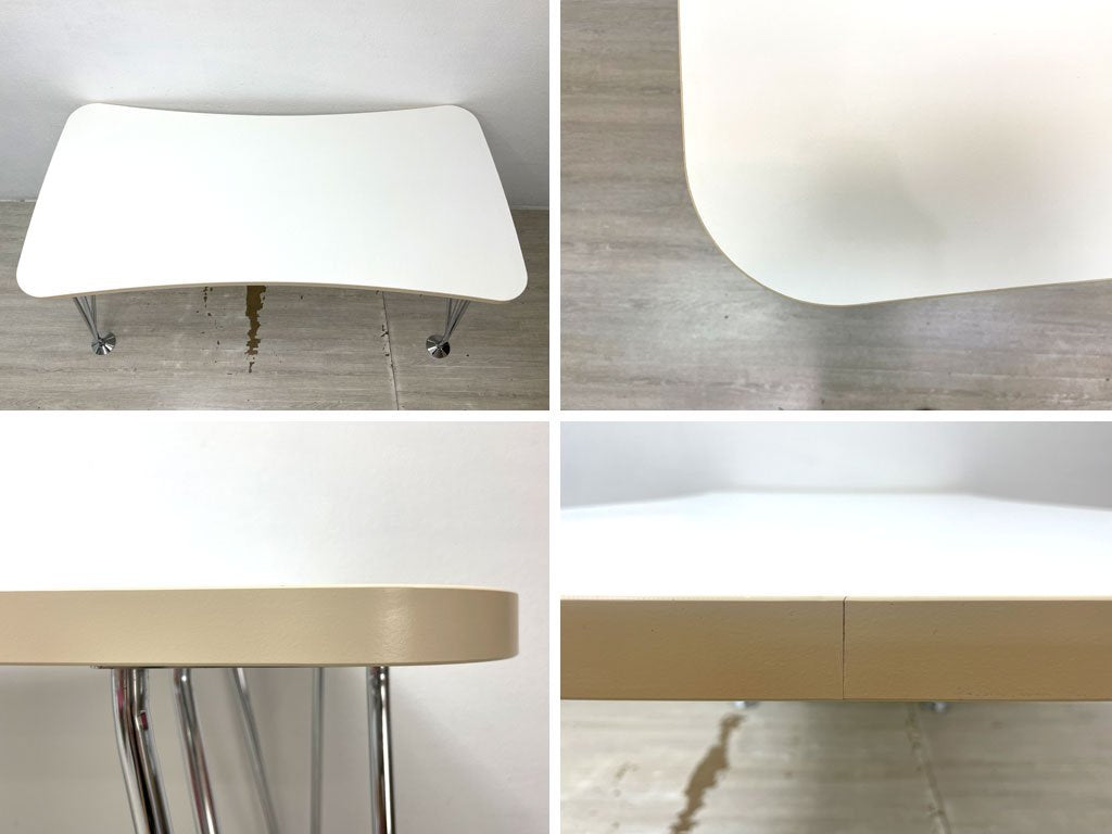 ホワイトラミネートトップにより、傷や汚れに強い素材で仕上げられ、ダイニングテーブルとしては勿論、ワークテーブルやオフィスの会議用テーブルとしても活躍出来るつくり。光沢のある軽量なクロームメッキスチールでできたレッグは、全体に程良いメリハリを加えています。
