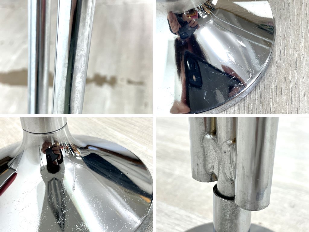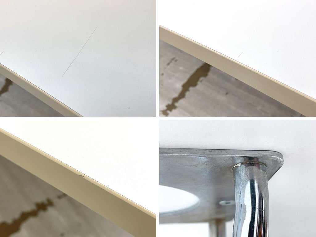 天板に線傷が数か所、脚部にはくすみや軽微な錆びが見受けられます。また、天板縁には経年による黄変が見られるもののいずれも大きく目立つものではございません。グラつき等ご使用に影響のあるダメージは無く、今後も十分実用頂けるコンディションを保っております。