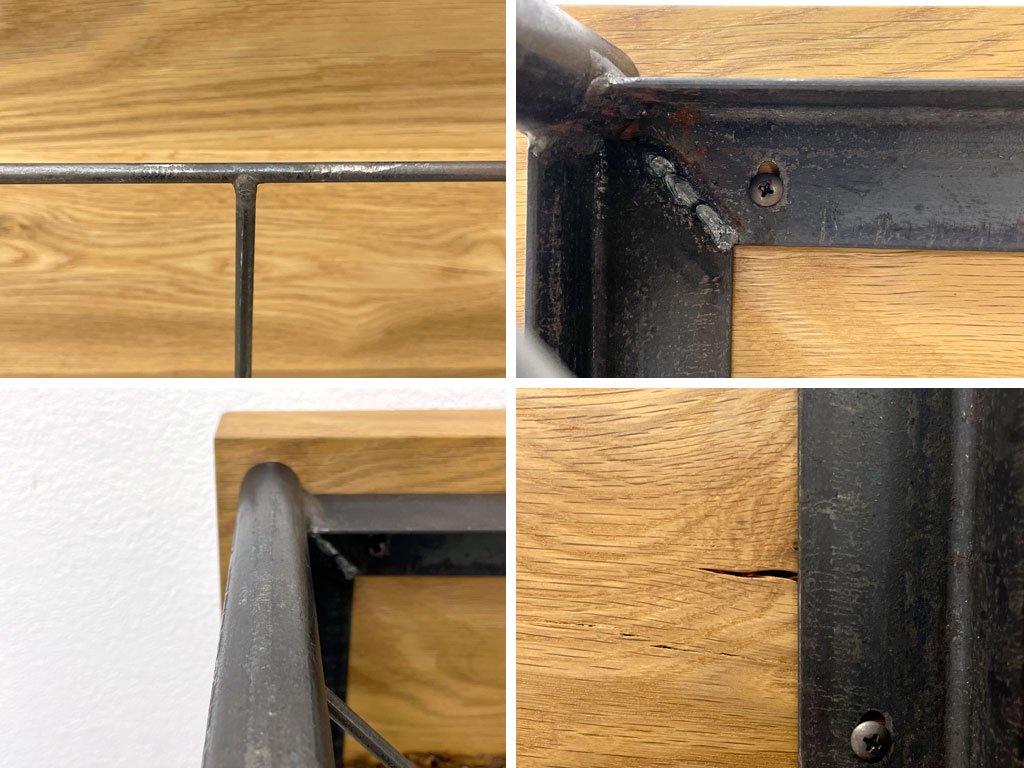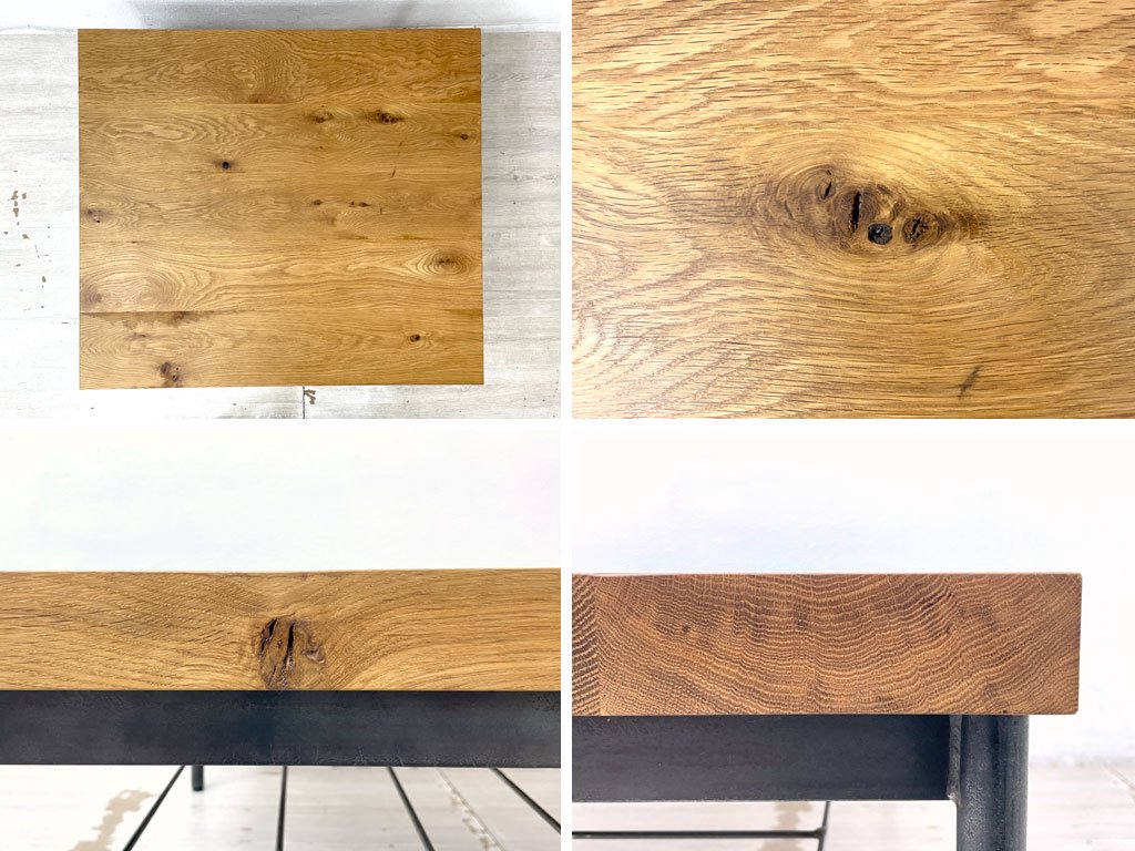 節を残したホワイトオーク無垢材天板に、ビンテージ加工が施されたブラック色アイアンを組み合わせ、自然素材×金属其々の質感と重厚感を存分に楽しめる趣あるリビングアイテム