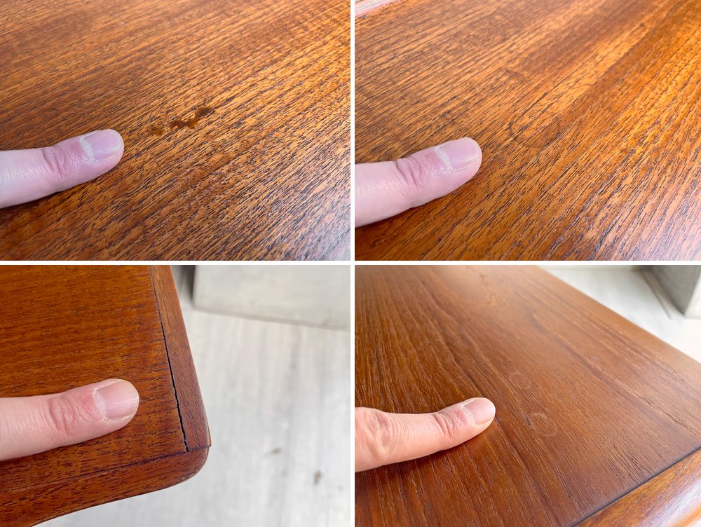※軽くサンディングを行ったのちオスモカラーチークワックス、仕上げにオスモカウンタートップオイルと、重ねてコーティングを行っておりますので撥水性、防汚性が高くさらに熱による輪染みにも強くなっておりますので安心してご使用頂けます。