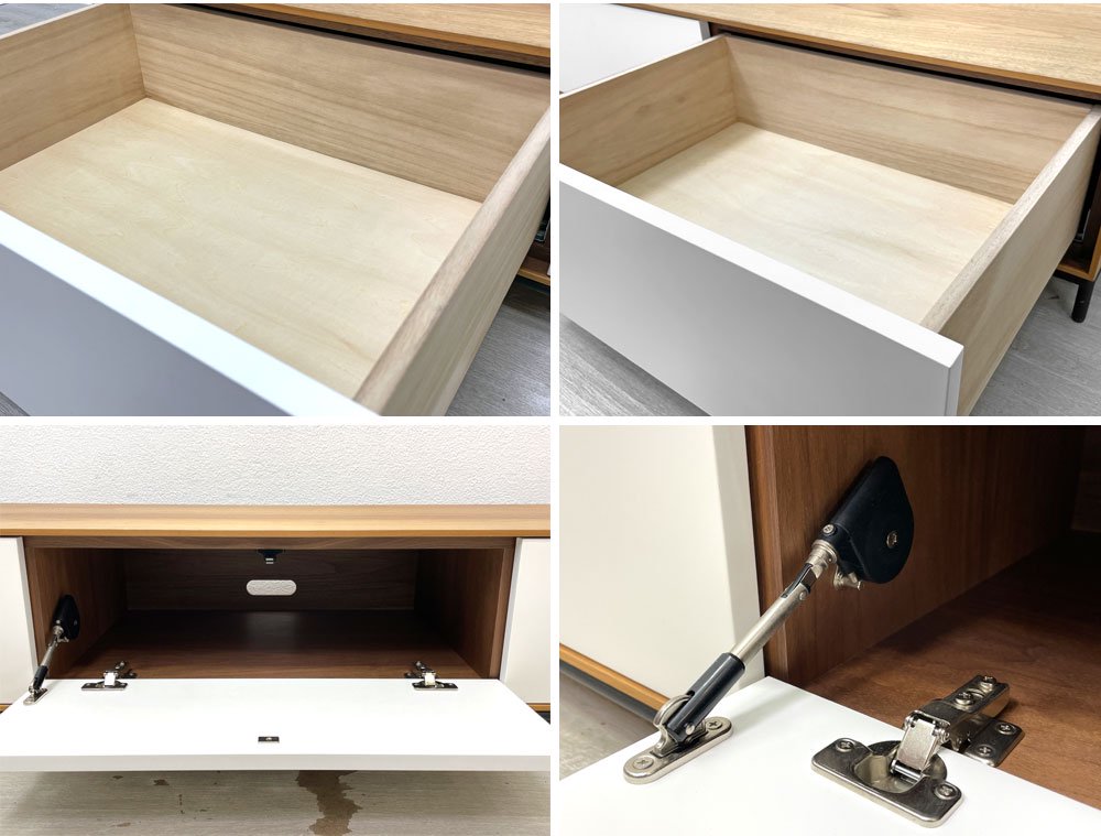ウォールナット材天板はテレビ周りの無機質な印象を緩和。清潔感のあるホワイト色フリップドアとプッシュアップ式の引出しがブラウン色とのメリハリを効かせています。幅180cmの広々としたサイズ感は大型の液晶テレビの設置は勿論、お気に入りの雑貨や観葉植物、スピーカー等を並べるローボードとしても。高さ30cmと比較的低めの設計なので、圧迫感は無く、ローソファや床で暮らすライフスタイルにも◎です!