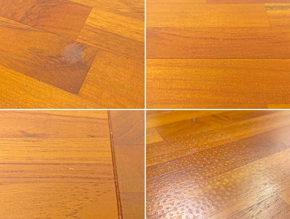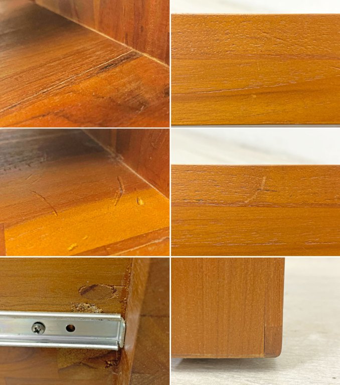 使用に伴う擦れや傷、軽微な割れがございます。また、天板には僅かな染みや設置痕による塗装ムラが見受けられます。抽斗の開閉はスムーズに行え、ガタツキ等の使用に問題となるダメージは無く、これからも安心してご使用いただけるコンディションを保っております。
