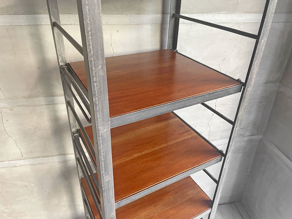 温かみあるアフリカンマホガニーの板材と無機質なアイアンフレームを組み合せた異素材ミックスシリーズ。直線を基調としたシルエットで抜け感を感じるオープンデザインなシェルフ。