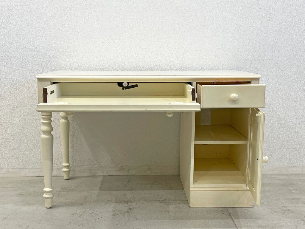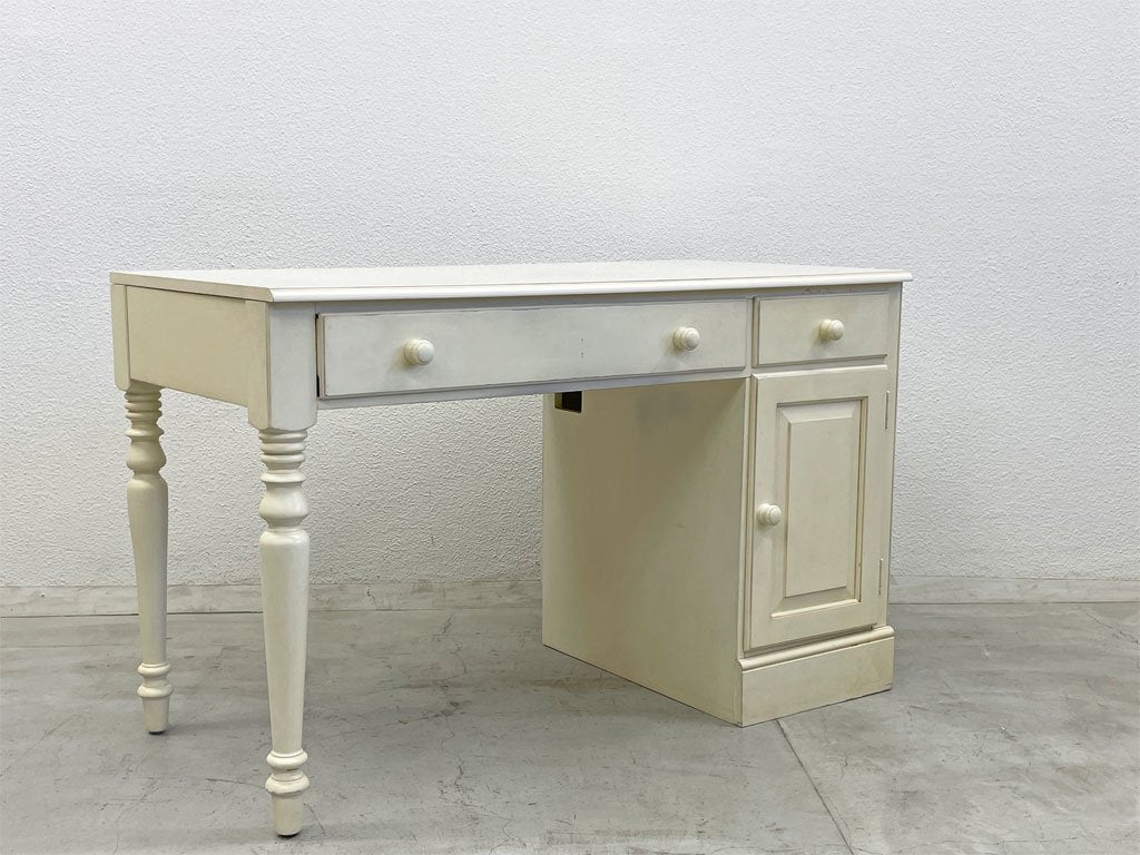 ホワイトとベージュの中間のようなシャビーシックな色合いとクラシックなデザインがマッチしたデスク。