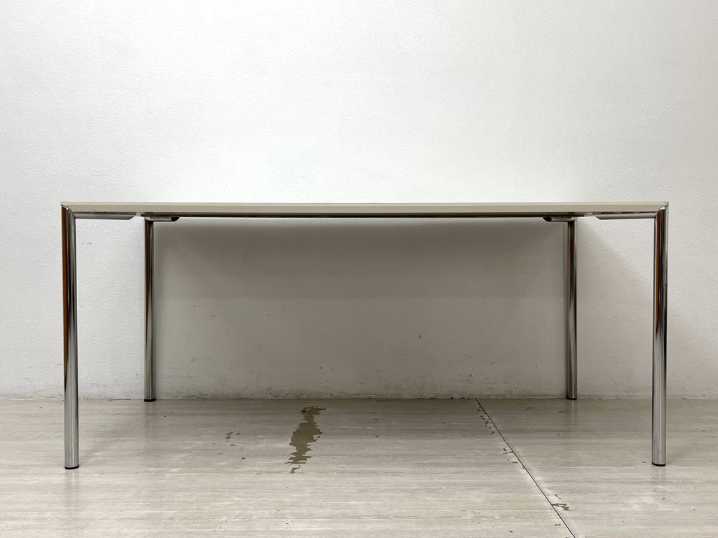 こちらはフレデリシア社にて販売されていたダイニングテーブルです。明るく清潔感溢れるホワイトメラミン天板と光沢のあるスチールレッグで構成。直線を基調としたシンプルなフォルム故に、素材の個性やディティールへの拘りが目に留まるアーバンモダンデザインです。