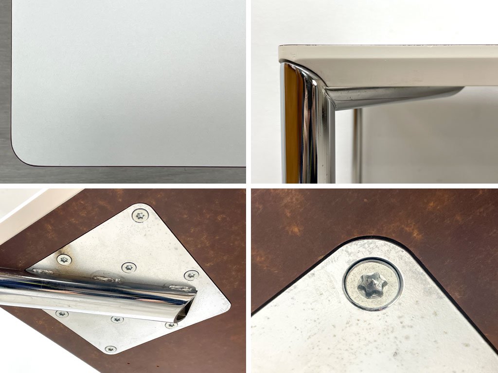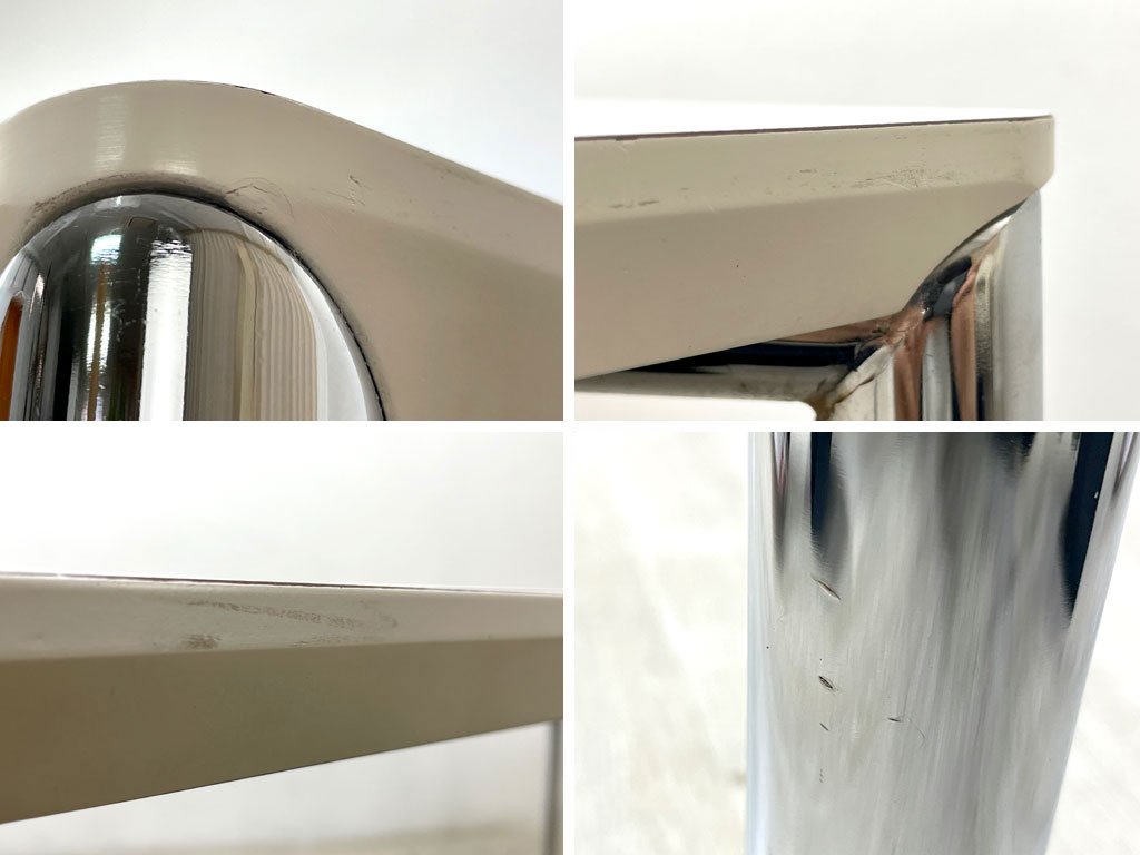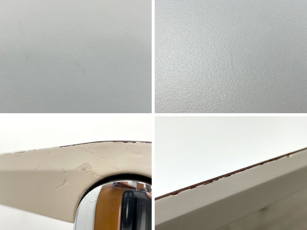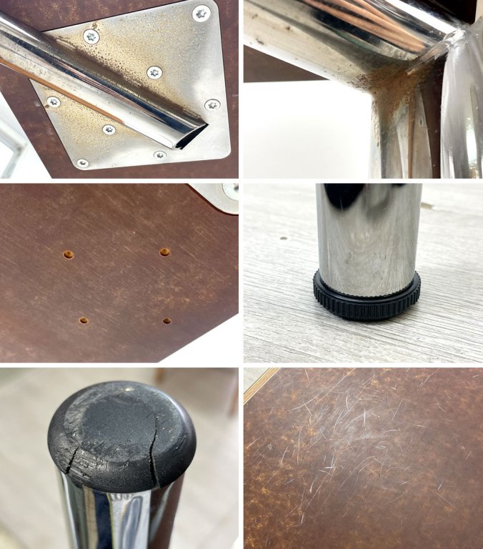 使用に伴い、天板の側面や脚部には擦れや傷、打痕、落としきれない汚れ、くすみ、錆などが見られます。また脚部先端のプラスチックパーツにはヒビ割れの箇所が確認でき、一部欠品の箇所には非純正のパーツにて代用しておりますが、実使用に影響はございません。天板表面には著しく美観を損ねるようなダメージは見られず、これからも実用いただけるコンディションを保っております。