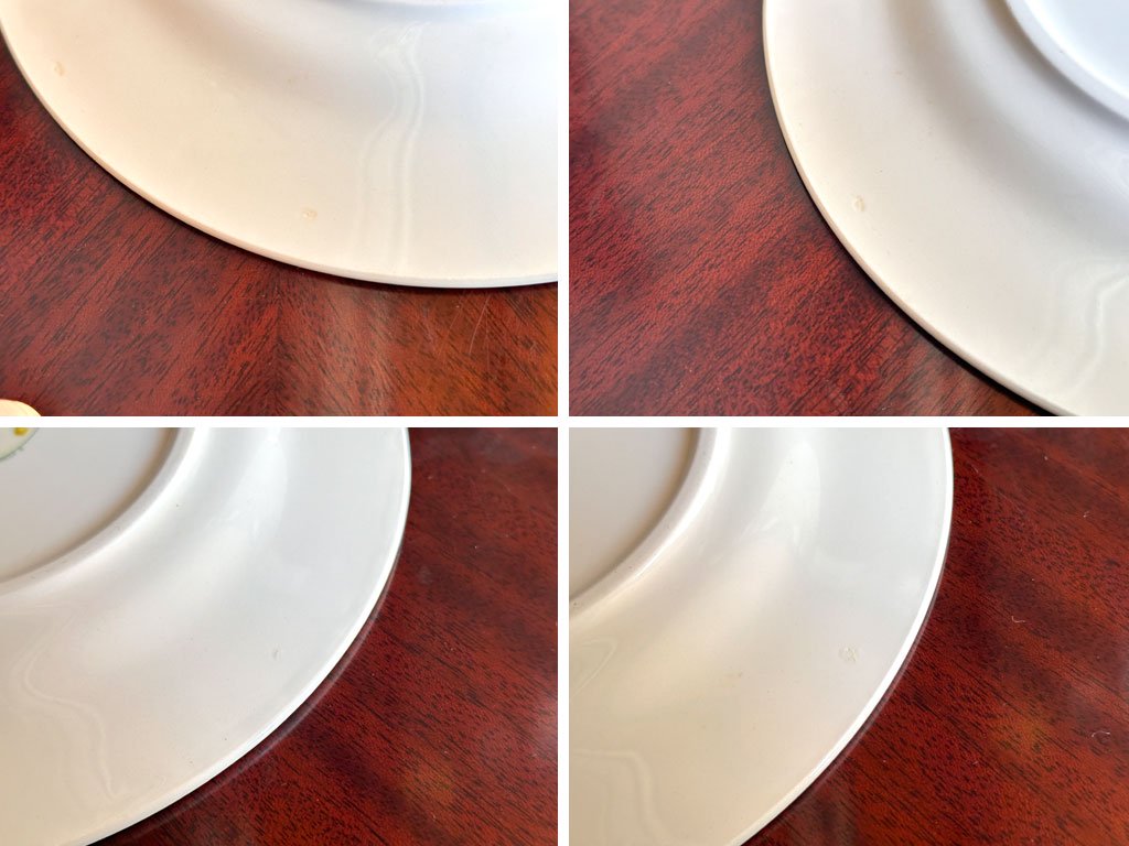 使用に伴う極僅かな擦れや、光の加減で見える程度のカトラリー傷、製造時についたものと思われる窯跡やホツ等が見受けらますが、比較的綺麗なコンディションとなっております。