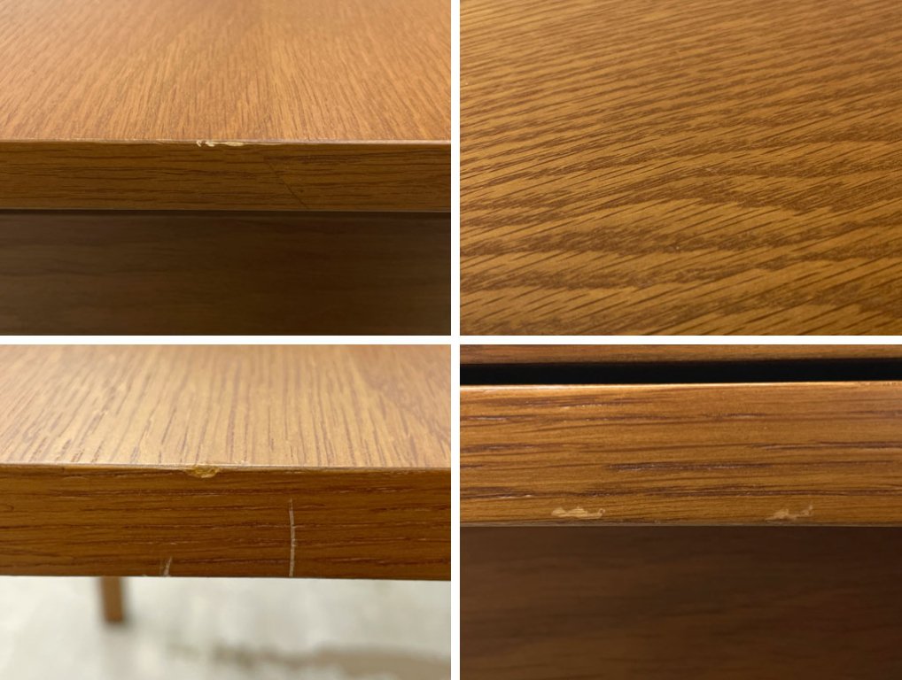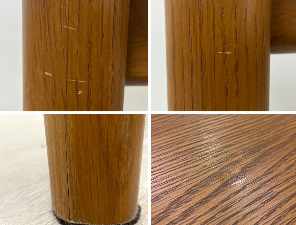 使用に伴う擦れや傷が僅かにございます。また、天板の側面や脚部に傷や軽微な打痕が見受けられます。脚部の床との設置面に近い部分に割れがございますが強度に問題は無く、これからも安心してご使用頂けるコンディションを保っております。