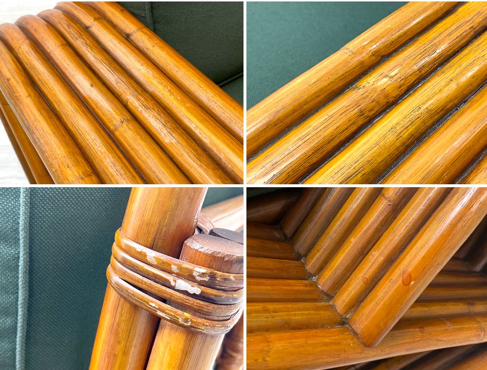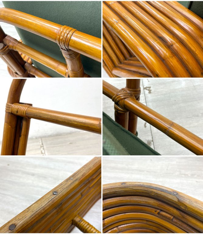 こちらはビンテージ品となります。経年に伴う擦れや傷、打痕、染み、ラタンの一部割れ等が散見されますが、美観を大きく損ねるような汚れや、機能を損なうような大きなダメージなどはございません。ファブリックとウレタンは後年にて張り替えられているようで、これからも気持ちよくお使いいただけるかと思われます。