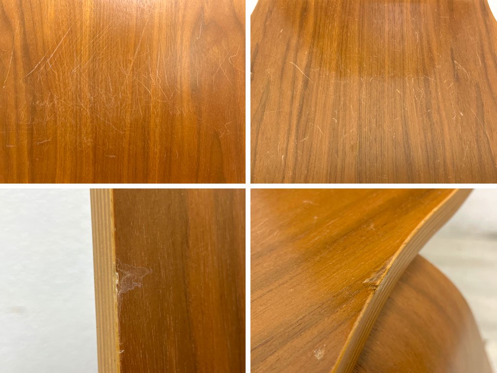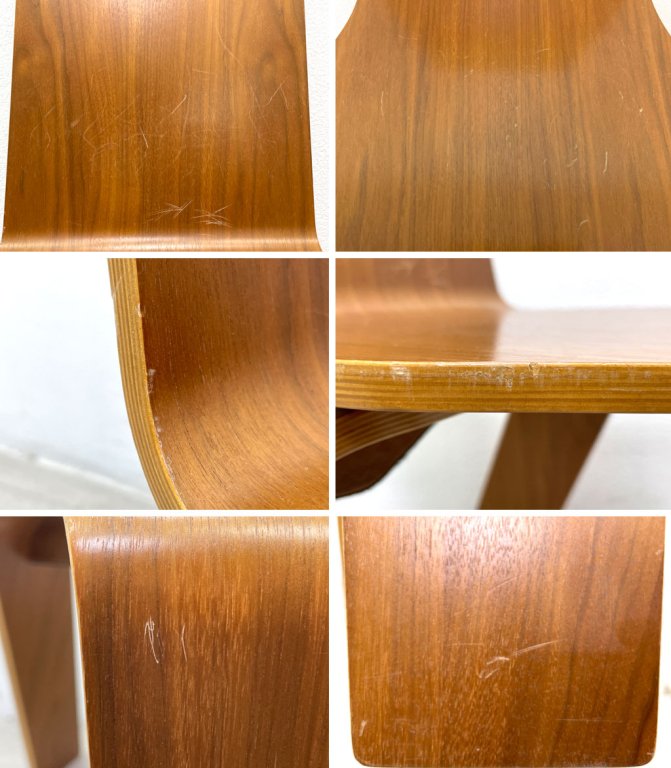 こちらは既に販売が終了している同社の廃番プロダクト「ウォールナット プライウッド スタッキングチェア」になります。ダークブラウンの落ち着いた色合いと心地よい杢目の表情が目を惹くウォールナット材。プライウッド成型で作られた都会的な印象のフォルムは、座らない時も画になります。軽量且つしなやかな強度。2脚重ねて収納する事も出来ますので、普段使いは勿論、来客時の補助椅子としても活躍してくれます。
