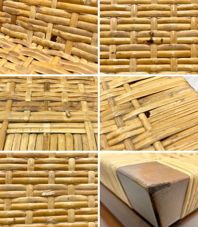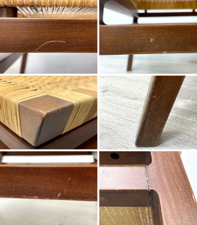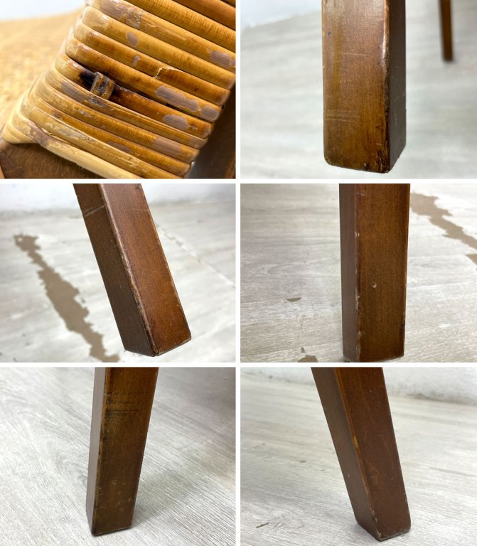 使用に伴う擦れや傷、タッチアップによる補修痕が散見されます。また、背と座のバンブーに一部破損があり切れている所がございます。脚部の連結部に僅かな隙間がございますが、強度に問題はなく、これからも安心してご使用頂けるコンディションを保っております。