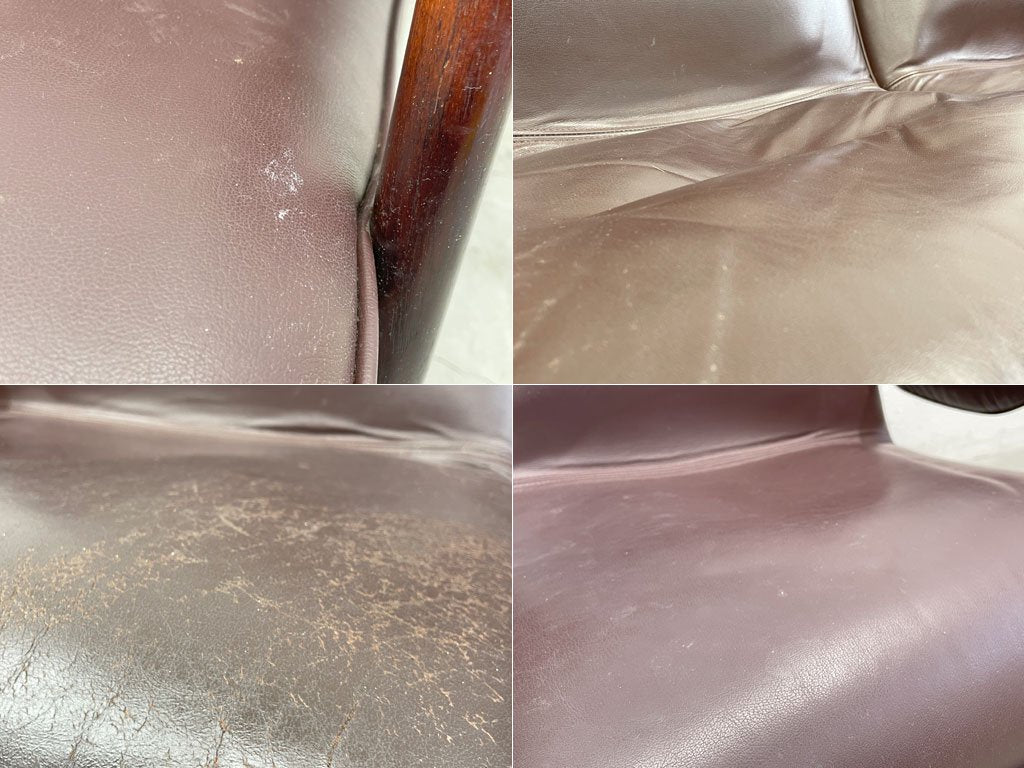 正面から見て左のシートにはレザーのクラック、中央のシートにはヘタリ、右のシートにはウレタンクッションの変形が見られます。
