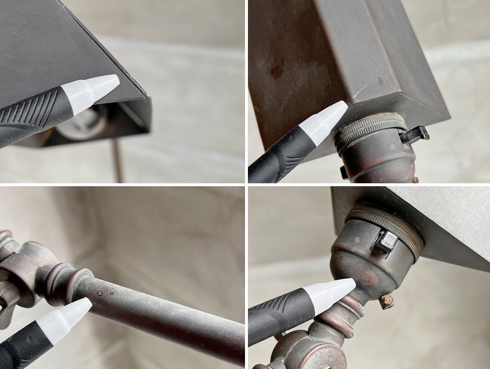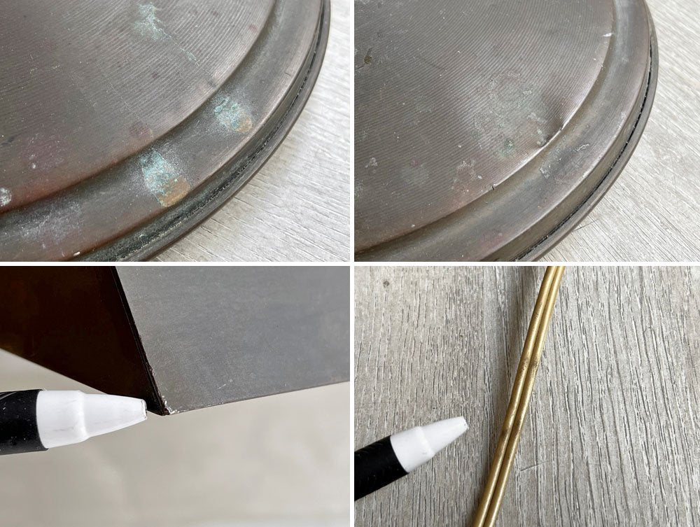 全体的に酸化によるくすみ、ベースなどの一部に緑青が見られます。そのほか、細かな打痕や擦り傷が散見されるものの、通常使用に支障を来すような不具合はなく、古いお品物ながら十分実用可能なコンディションを保っております。