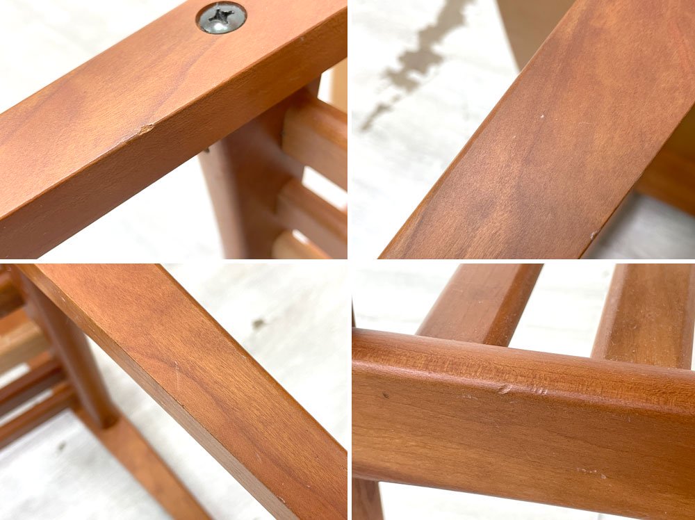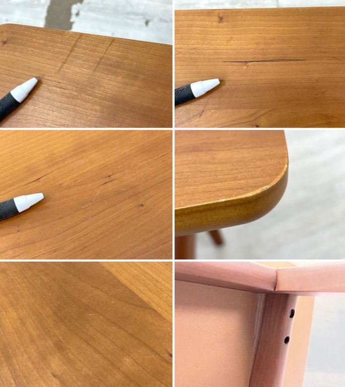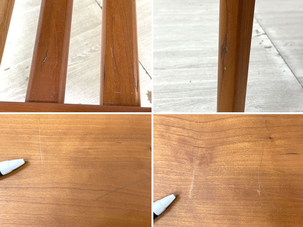 使用に伴い、天板には擦れや線傷、打痕、レタッチ痕が散見されます。またフレームにも同様のダメージが確認できます。若干の使用感はございますが、がたつきやぐらつきなどはなくこれからもまだまだ実用頂けるコンディションを保っております。