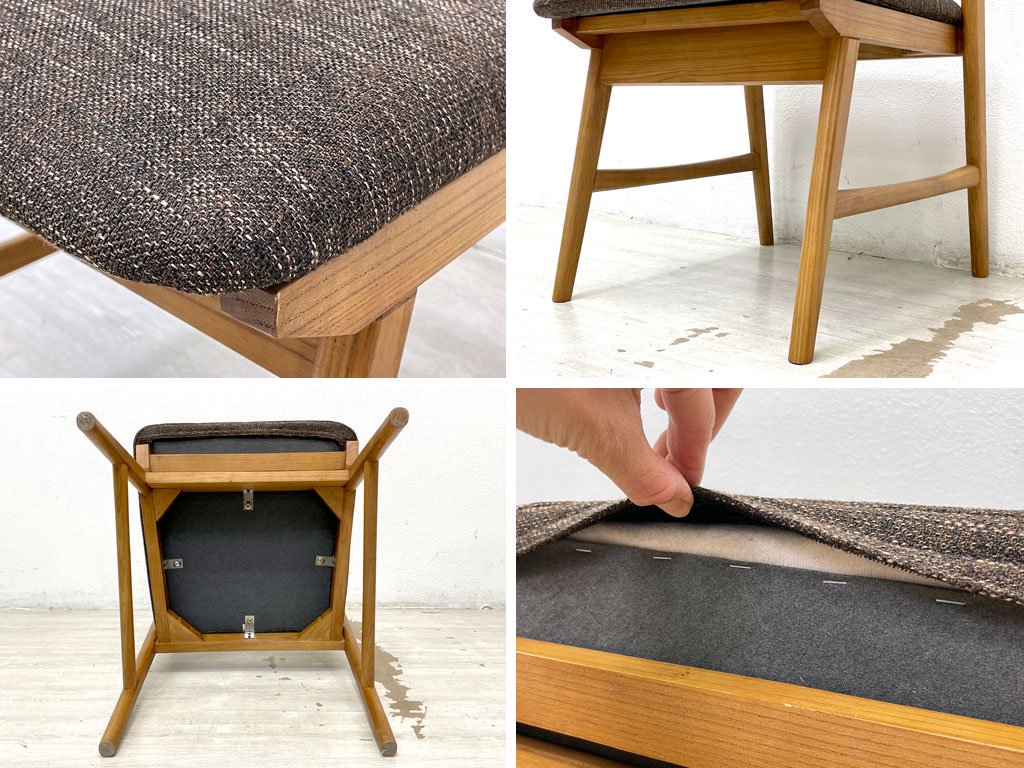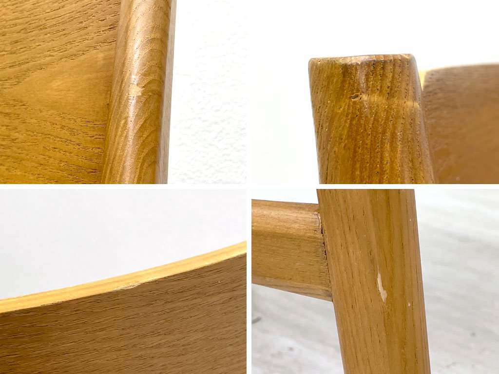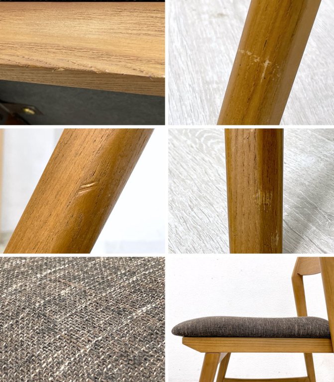 使用に伴い木部に擦れや傷、打痕、シートに薄染みや毛羽立ちなどが見受けられます。またクッションにややヘタリが感じられますが、ご使用に問題となるようなグラツキやガタツキなどはございません。コンディションを加味し、通常よりもお求めやすい価格にてご提供いたします。