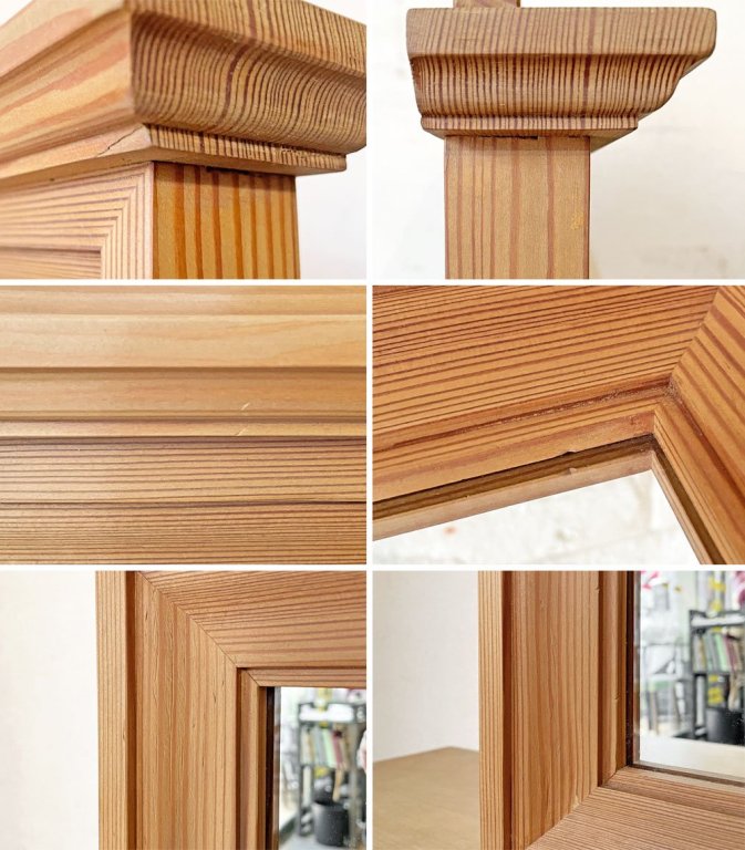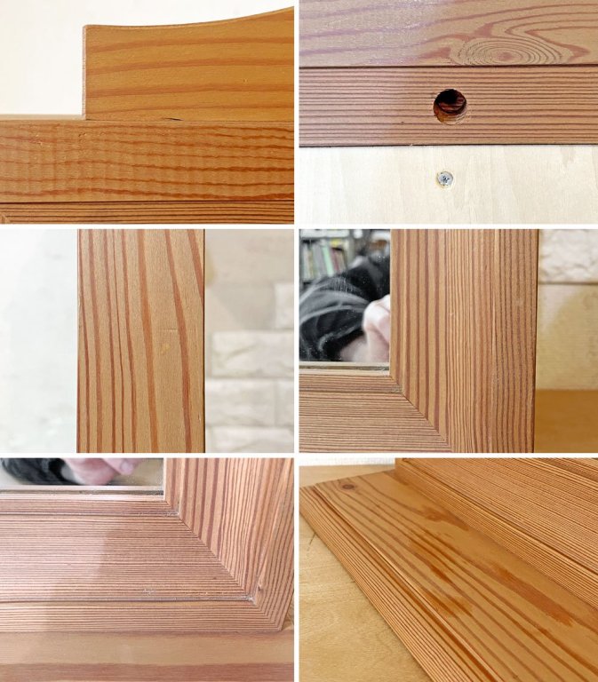 フレーム全体に擦れや傷、打痕や縁の削れ、シミ痕や黒ずみなどの取り切れない汚れ等がございます。また、鏡面には光の加減で見える程度の細かな擦れ傷がございますが、ご使用に問題となるダメージはございません。使い込むことで増える傷や汚れも風合いとしてお楽しみいただきながら、今後も安心して実用いただけるコンディションを保っております。なお、比較的重量のあるお品物となります。壁掛けでご使用される場合はご注意くださいませ。
