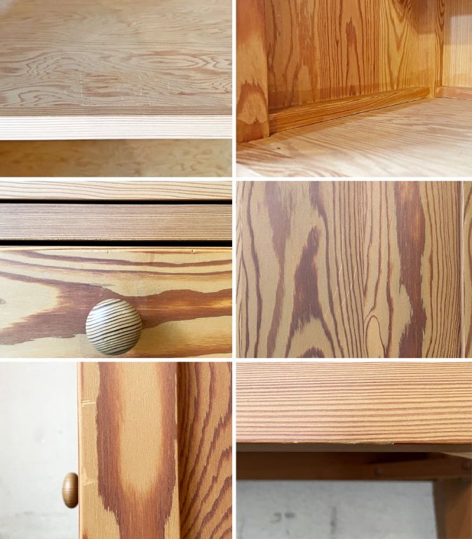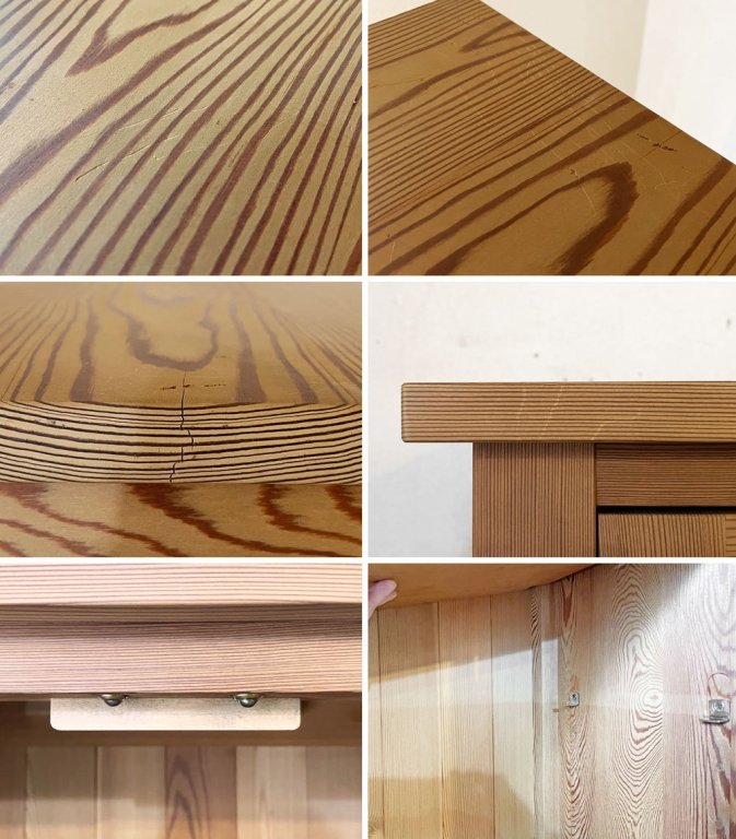 全体に擦れや傷、打痕や縁の削れ、シミ痕や黒ずみなどの取り切れない汚れ等がございます。また、天板側面に僅かな亀裂が確認できるとともに、棚板の日焼け痕が見受けられますが、ご使用に問題となるダメージはございません。使い込むことで増える傷や汚れも風合いとしてお楽しみいただきながら、今後も安心して実用いただけるコンディションを保っております。