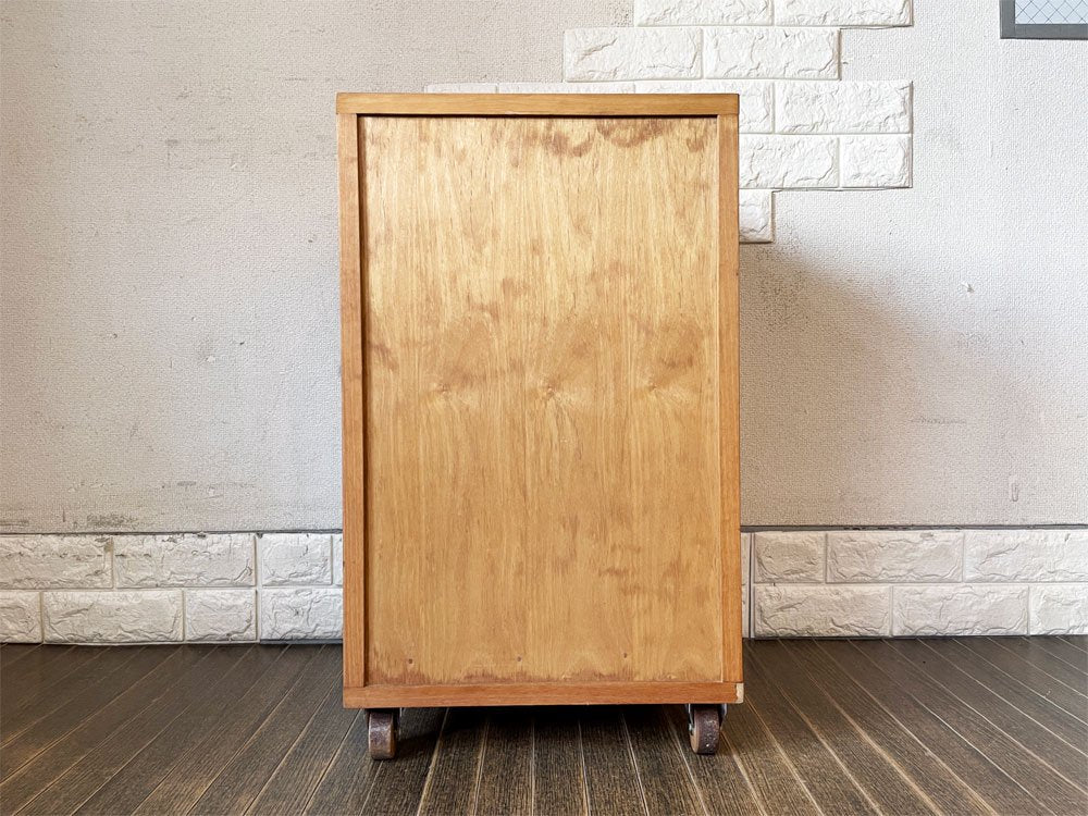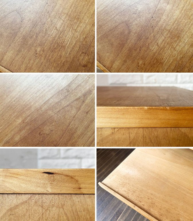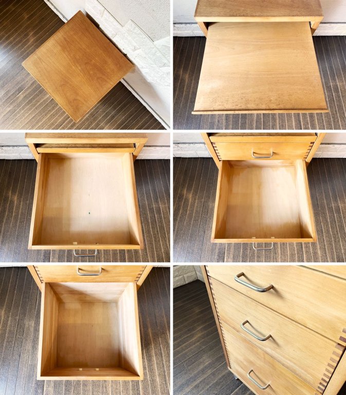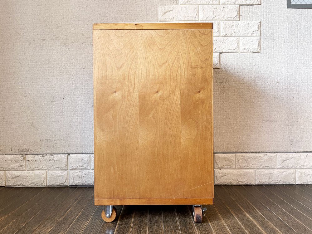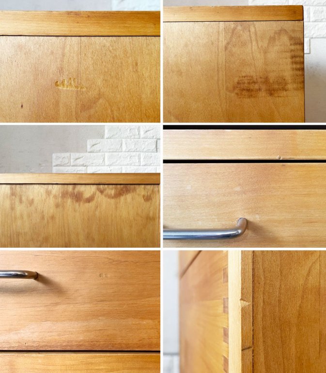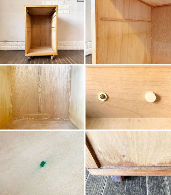 全体に擦れや傷、縁の削れや打痕、鏡面の剥がれ、シミやヤケによる木色のムラ、取り切れない汚れ等が散見されます。また、抽斗内部にはシミ汚れやペン痕などが見受けられるとともに、把手のビスカバーが1箇所欠品しております。なお、キャスターは木製のため、床面によっては摩擦によりスムーズに回転しないことがございますが、ロックや動作に不具合はございません。やや使用感はございますが、これからもまだまだ実用頂けるコンディションを保っております。